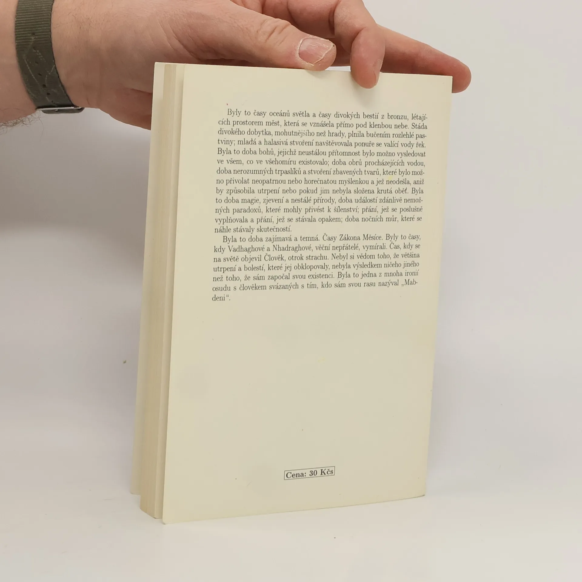 Byly to časy oceánů světla a časy divokých bestií z bronzu, létajících prostorem měst, která se vznášela přímo pod klenbou nebe. Stáda divokého dobytka, mohutnějšího než hrady, plnila bučením rozlehlé pastviny; mladá a halasivá stvoření navštěvovala ponuře se valící vody řek. Byla to doba bohů, jejichž neustálou přítomnost bylo možno vysledovat ve všem, co ve všehomíru existovalo; doba obrů procházejících vodou, doba nerozumných trpaslíků a stvoření zbavených tvarů, které bylo možno přivolat neopatrnou nebo horečnatou myšlénkou a jež neodešla, aniž by způsobila utrpení nebo pokud jim nebyla složena krutá oběť. Byla to doba magie, zjevení a nestálé přírody, doba událostí zdánlivě nemožných paradoxů, které mohly přivést k šílenství; přání, jež se poslušně vyplňovala a přání, jež se stávala opakem; doba nočních můr, které se náhle stávaly skutečností. Byla to doba zajímavá a temná, časy Zákona Měsíce. Byly to časy, kdy Vadhaghové a Nhadraghové, věční nepřátelé, vymírali. Čas, kdy se na světě objevil Člověk, otrok strachu. Nebyl si vědom toho, že většina utrpení a bolestí, které jej obklopovaly, nebyla výsledkem ničeho jiného než toho, že sám započal svou existenci. Byla to jedna z mnoha ironií osudu s člověkem svázaných s tím, kdo sám svou rasu nazýval „Mab-deni". (Zdroj: legie.info)... celý text