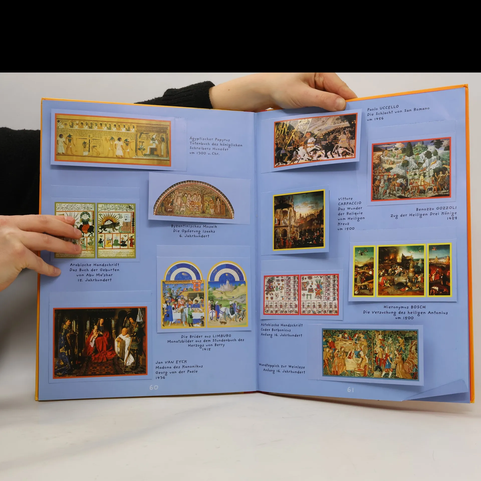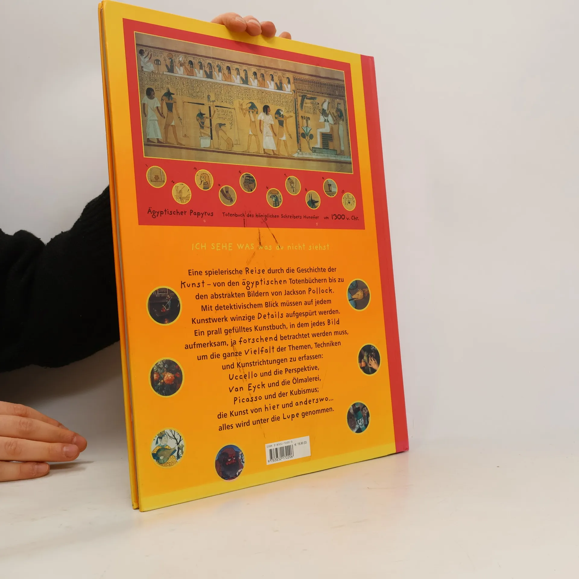 Auf diesem Spaziergang durch die Galerie der Bilder ist alles so, wie Kinder es gern haben: bunt und geheimnisvoll, detailreich und spannend. Da gibt es vieles zu entdecken, und die Freude am Betrachten lenkt Augen und Sinn in andere Welten und andere Zeiten. 23 berühmte Gemälde – so Hieronymus Boschs „Versuchung des Hl. Antonius", die „Hochzeit zu Kanaa" von Paolo Veronese oder Renoirs „Le Moulin de la Galette" – finden sich in diesem wundervollen Geschenkbuch für kleine Betrachter mit großer Phantasie. Schwierige Aufgaben gilt es da zu lösen, denn aus jedem der Bilder sind kleine Ausschnitte „herausgefallen". Und damit sie nicht mehr so rumliegen am Rande der Seite, müssen sie wieder zurück an die richtige Stelle im bunten Treiben: Doch die will erst gefunden werden! So werden kleine Leute spielerisch zur Kunst hingeführt, und der Spaß wird dabei ganz groß geschrieben.Vor allem: Dieses einmalige Buch weist Kindern (und übrigens nicht nur ihnen) den Weg, sich in Bilder zu vertiefen, in sie einzutauchen und sich in ihnen zu verlieren, dabei alles um sich herum zu vergessen. Und vielleicht werden sie sich diese Fähigkeit bewahren, werden sie als Erwachsene Bildern mit gleicher Aufgeschlossenheit und Vorbehaltlosigkeit, mit gleicher Freude gegenübertreten. Kinder sehen die Welt mit ihren Augen