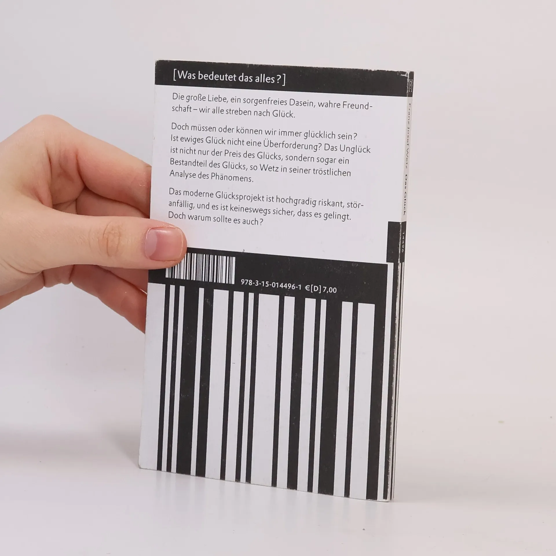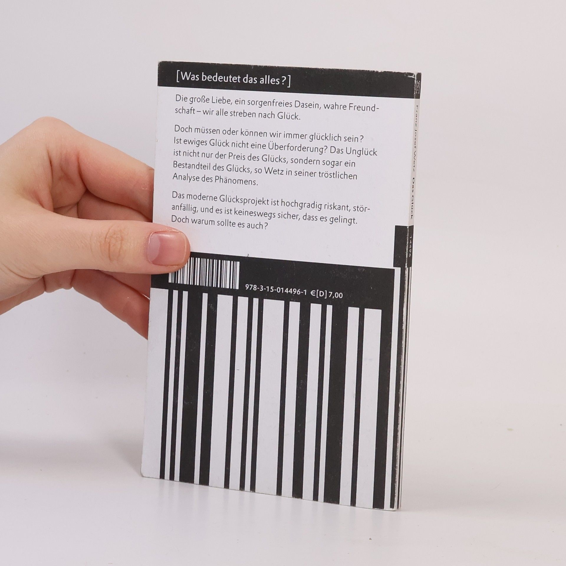 Die große Liebe, ein sorgenfreies Dasein, wahre Freundschaft – wir alle streben nach Glück. Doch müssen oder können wir immer glücklich sein? Ist ewiges Glück nicht eine Überforderung? Das Unglück ist nicht nur der Preis des Glücks, sondern sogar ein Bestandteil des Glücks, so Wetz in seiner tröstlichen Analyse des Phänomens. Das moderne Glücksprojekt ist hochgradig riskant, störanfällig, und es ist keineswegs sicher, dass es gelingt. Doch warum sollte es auch?