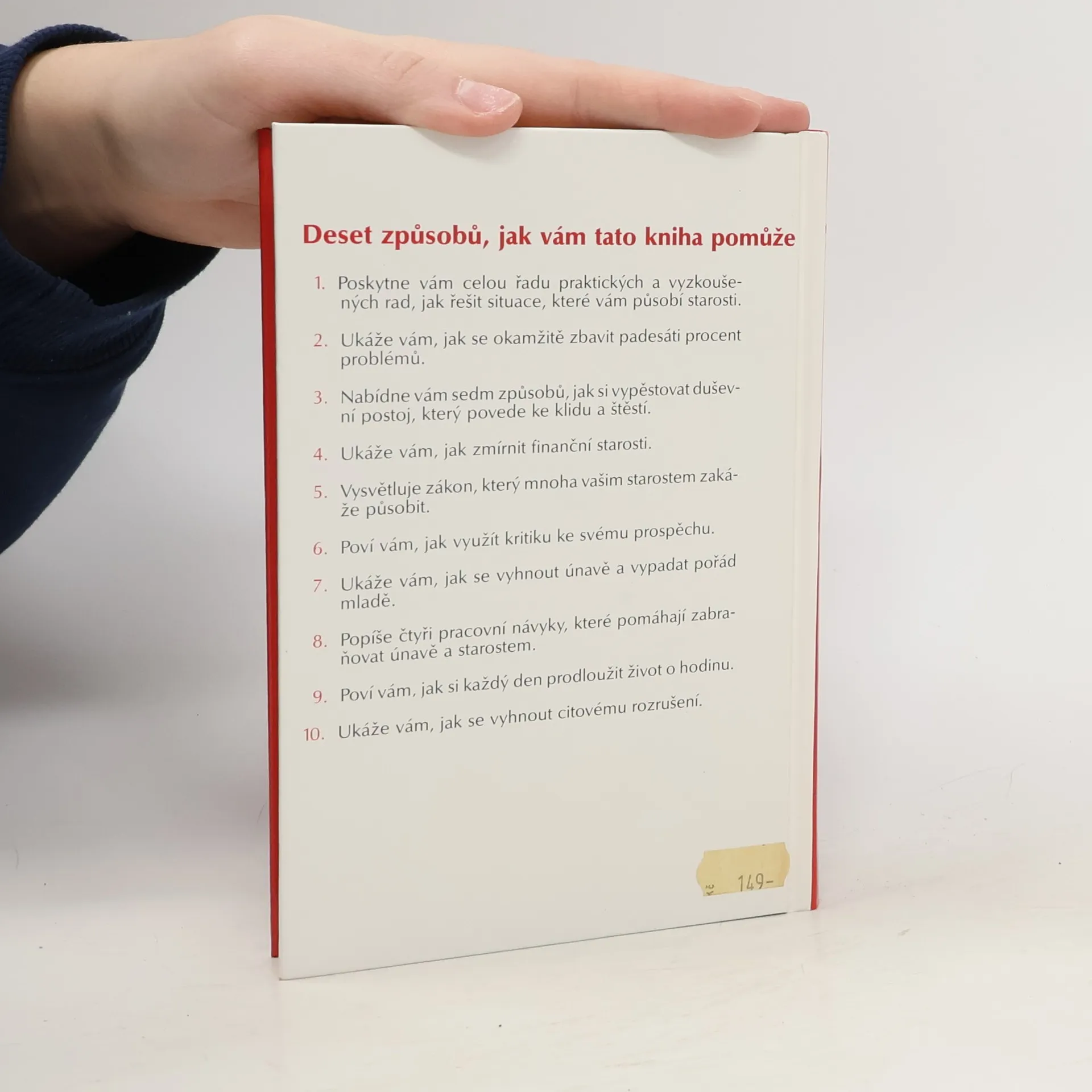 Deset způsobů, jak vám tato kniha pomůže: 1. Poskytne vám celou řadu praktických a vyzkoušených rad, jak řešit situace, které vám působí starosti. 2. Ukáže vám, jak se okamžitě zbavit padesáti procent problémů. 3. Nabídne vám sedm způsobů, jak si vypěstovat duševní postoj, který povede ke klidu a štěstí. 4. Ukáže Vám, jak zmírnit finanční starosti. 5. Vysvětluje zákon, který mnoha vašim starostem zakáže působit. 6. Poví vám, jak využít kritiku ke svému prospěchu. 7. Ukáže vám, jak se vyhnout únavě a vypadat pořád mladě. 8. Popíše čtyři pracovní návyky, které pomáhají zabraňovat únavě a starostem. 9. Poví vám, jak si každý den prodloužit život o hodinu. 10. Ukáže vám, jak se vyhnout citovému rozrušení. (méně textu)