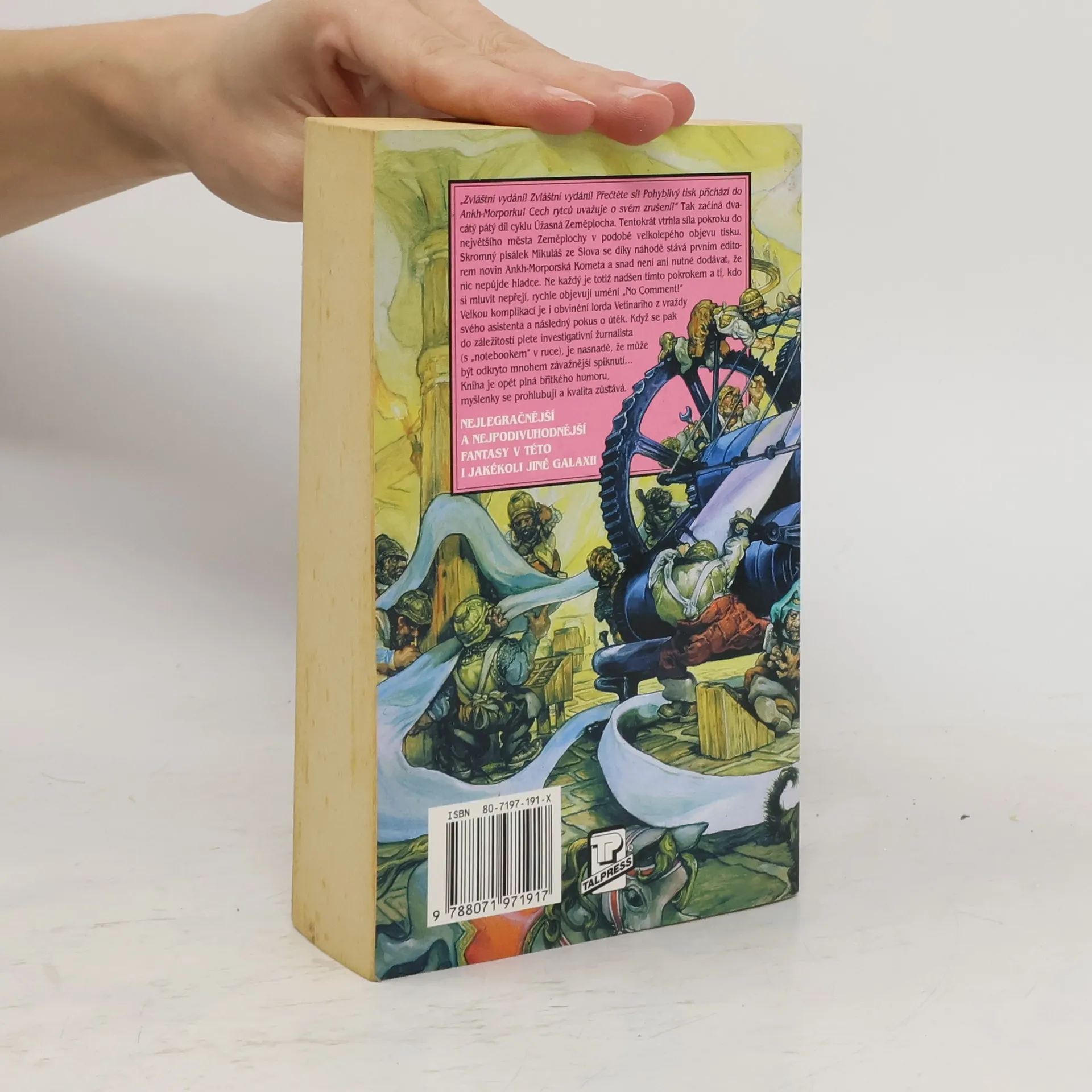 „Zvláštní vydání! Zvláštní vydání! Přečtěte si! Pohyblivý tisk přichází do Ankh-Morporku! Cech rytců uvažuje o svém zrušení!“ Tak začíná dvacátý pátý díl cyklu Úžasná Zeměplocha. Tentokrát vtrhla síla pokroku do největšího města Zeměplochy v podobě velkolepého objevu tisku. Skromný pisálek Mikuláš ze Slova se díky náhodě stává prvním editorem novin Ankh-Morporská kometa a snad není ani nutné dodávat, že nic nepůjde hladce. Ne každý je totiž nadšen tímto pokrokem a ti, kdo se mluvit nepřejí, rychle objevují umění „No Comment!“ Velkou komplikací je i obvinění lorda Vetinariho z vraždy svého asistenta a následný pokus o útěk. Když se pak do záležitostí plete investigativní žurnalista (s „notebookem“ v ruce), je nasnadě, že může být odkryto mnohem závažnější spiknutí... Kniha je opět plná břitkého humoru, myšlenky se prohlubují a kvalita zůstává. Úžasná Zeměplocha, kniha 25., přeložil Jan Kantůrek.