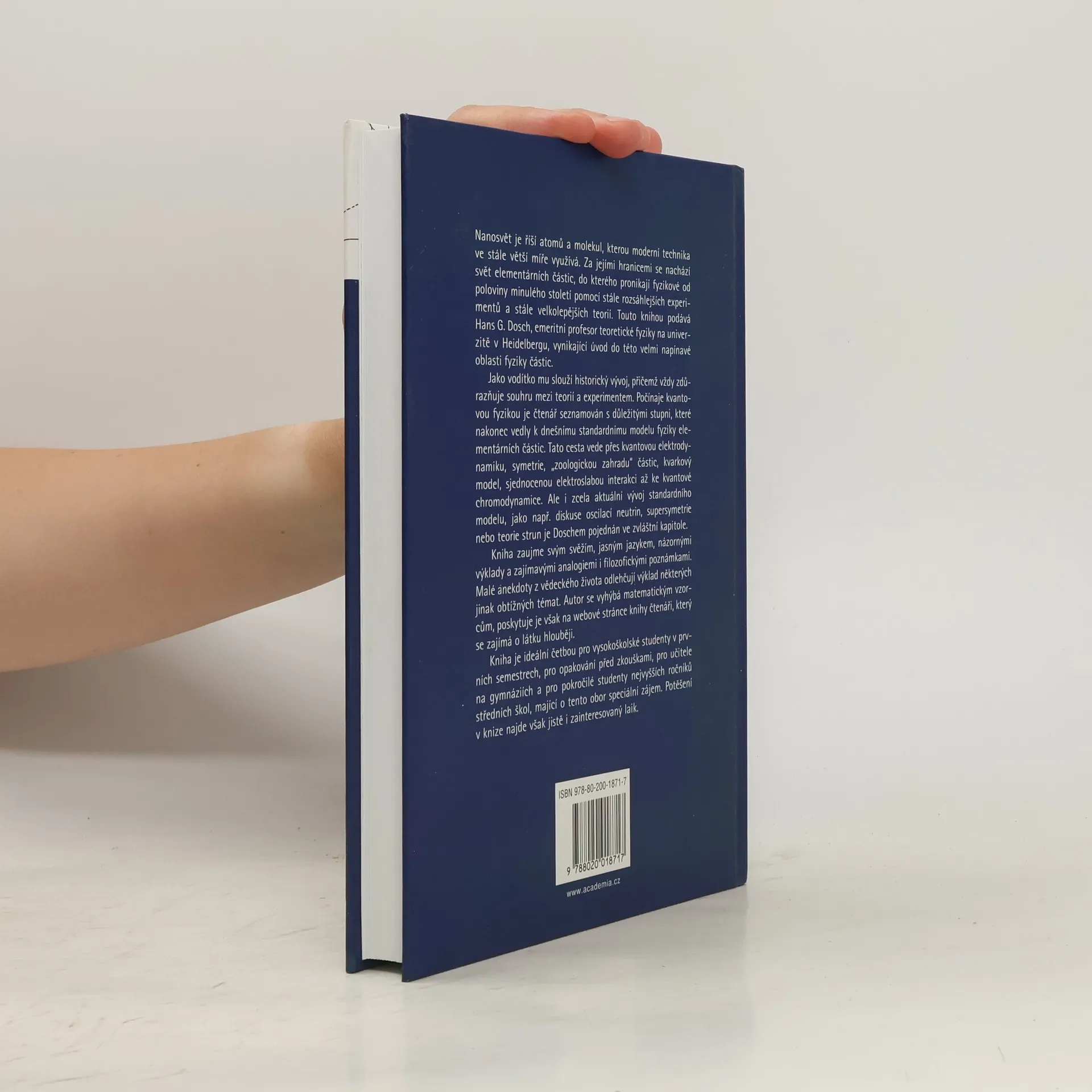 Nanosvět je říší atomů a molekul, kterou moderní technika stále více využívá. Za jeho hranicemi se nachází svět elementárních částic, do kterého fyzikové pronikají pomocí rozsáhlých experimentů a teorií. Hans G. Dosch, emeritní profesor teoretické fyziky na univerzitě v Heidelbergu, podává vynikající úvod do fascinující oblasti fyziky částic. Kniha sleduje historický vývoj a zdůrazňuje souhru mezi teorií a experimentem. Čtenář se seznamuje s klíčovými kroky vedoucími k dnešnímu standardnímu modelu fyziky elementárních částic, včetně kvantové elektrodynamiky, symetrií, kvarkového modelu a kvantové chromodynamiky. Aktuální vývoj standardního modelu, jako jsou oscilace neutrin, supersymetrie a teorie strun, je rovněž podrobně probrán. Dosch používá svěží jazyk, názorné výklady a filozofické poznámky, přičemž malé anekdoty z vědeckého života usnadňují pochopení složitějších témat. Autor se vyhýbá matematickým vzorcům, ale nabízí je na webové stránce knihy pro zájemce o hlubší studium. Kniha je ideální pro vysokoškolské studenty, učitele a pokročilé studenty středních škol, ale potěší i laiky se zájmem o tuto oblast.