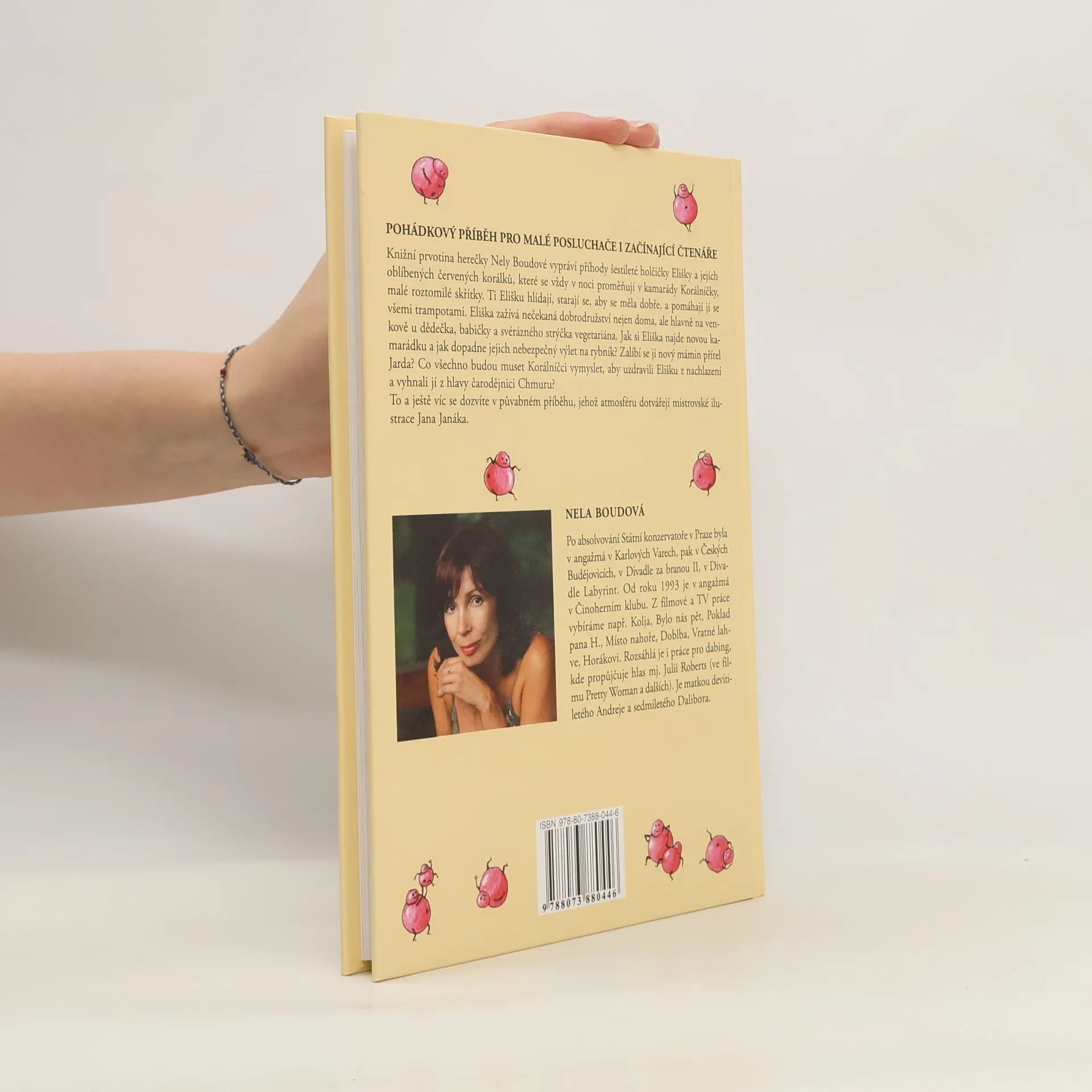 Pohádkový příběh pro začínající čtenáře. Knižní prvotina herečky Nely Boudové vypráví příhody šestileté holčičky Elišky a jejích oblíbených červených korálků, které se vždy v noci proměňují v kamarády Korálníčky, malé roztomilé skřítky. Ti Elišku hlídají, starají se, aby se měla dobře a pomáhají jí se všemi trampotami. Eliška zažívá nečekaná dobrodružství nejen doma, ale hlavně na venkově u dědečka, babičky a svérázného strýčka vegetariána. Jak si Eliška najde novou kamarádku a jak dopadne jejich nebezpečný výlet na rybník? Zalíbí se jí nový mámin přítel Jarda? Co všechno budou muset Korálníčci vymyslet, aby uzdravili Elišku z nachlazení a vyhnali jí z hlavy čarodějnici Chmuru? To všechno a ještě víc se dozvíte v půvabném příběhu, jehož atmosféru dotvářejí mistrovské ilustrace Jana Janáka.