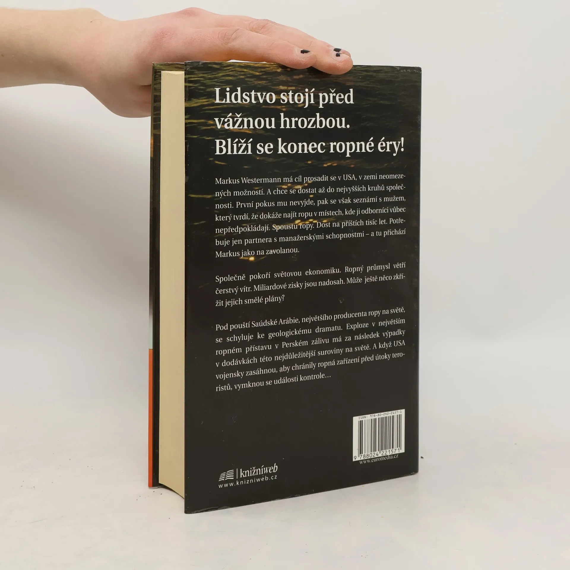 Představte si, že litr benzinu Natural 95 stojí více než sto korun. Noční můra? Ano. Ale to je jen začátek. Protože ropná éra neskončí až v okamžiku, kdy vyprázdníme poslední barel. Její konec nastane ve chvíli, kdy bude spotřeba ropy větší než vytěžené množství. A ten okamžik není tak vzdálený, jak se většina lidí domnívá. Problém je, že nikdo nemá pro tento katastrofický scénář účinný plán. Také Markuse Westermanna zaměstnávají jiné věci. Konečně se mu splní dávný sen - uchytí se v USA, kde hodlá udělat kariéru. Když se seznámí s Karlem Walterem Blockem, vycítí svou velkou příležitost. Starý ropný technik tvrdí, že v hlubinách země je dostatek této suroviny na příštích tisíc let - a on zná metodu jak ropu najít. Potřebuje však společníka s manažerskými schopnostmi. Někoho, jako je Markus. Svět rád uvěří dvojici, která slibuje pomoc a záchranu. A když se dostaví první úspěch, všichni hovoří o renesanci ropného věku. Avšak zdání klame. Poté co v Saúdské Arábii zkolabuje největší ropné pole na světě a Saúdové se všemožně snaží tuto skutečnost utajit, propuknou nepokoje nejen na Blízkém východě. Lidstvo stojí před nejtěžší hrozbou: konec světa, tak jak jsme ho znali, se blíží. Markus je jediný, kdo ještě věří, že se mu podaří kormidlo dějin otočit…