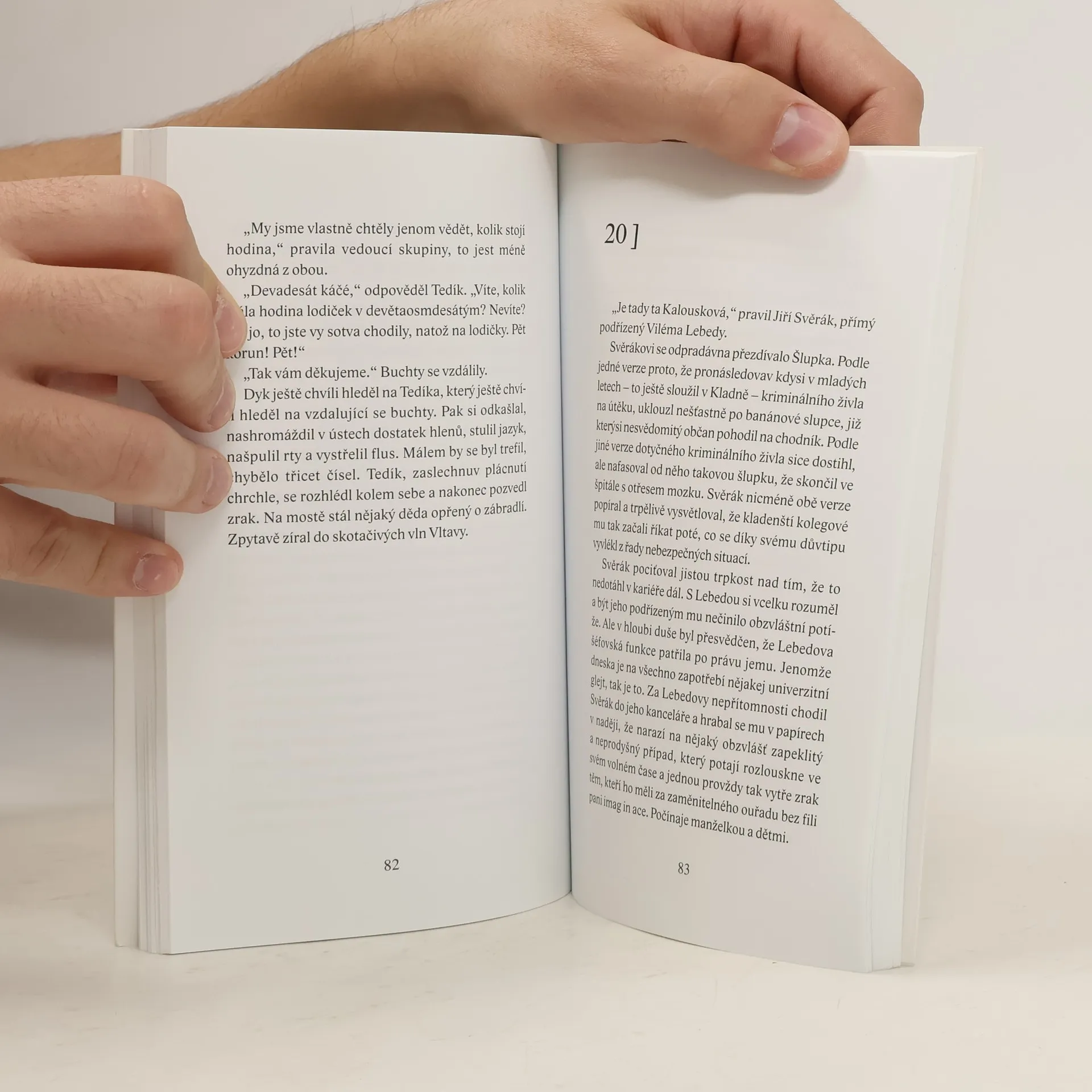 Po próze Příhodná chvíle, 1855 přichází Patrik Ouředník s novou prózou, jejíž děj je zasazen do současné Prahy. Na půdorysu fabulační hříčky s detektivní zápletkou virtuózně rozehrává pestrou škálu stylistických i myšlenkových vtipů, jež mu slouží k sarkastickému pojednání českého dneška. Hlavními hrdiny knihy jsou pražští důchodci, detektiv a znásilněná studentka výtvarných umění. Ačkoli je kniha postavena na humoru, ironii a hře se čtenářem, za tím vším se skrývají nelítostně vystižené obrazy ze života, jež umí Ouředník vyhmátnout a zachytit jako málokdo v současné české literatuře.