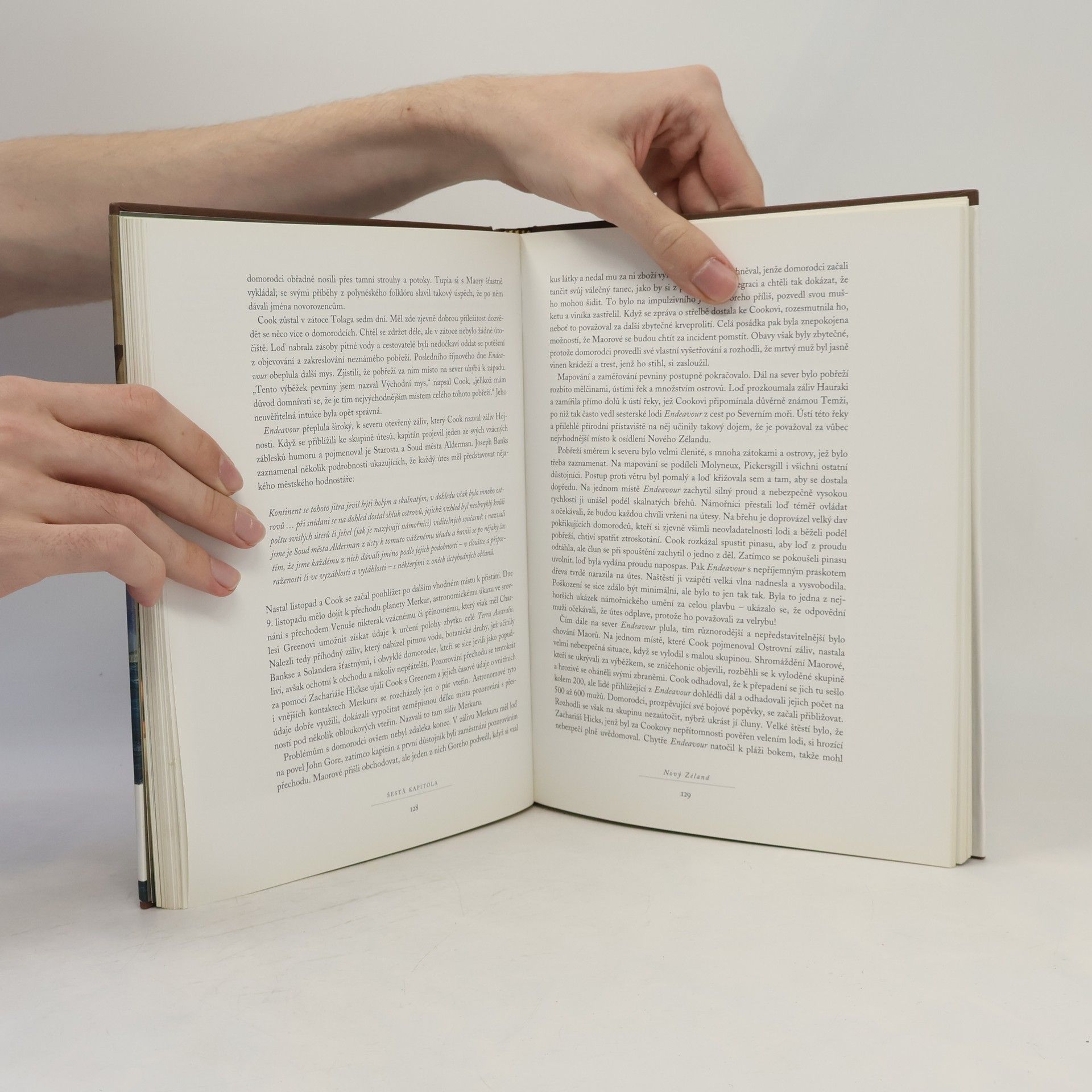 Podtitul: příběh první velkolepé námořní výpravy kapitána Cooka Cestopis o odvážné námořní výpravě kapitána Jamese Cooka kolem světa. Kniha podrobně popisuje plavbu Cookovy lodě Endeavour, která odrazila od anglických břehů v srpnu roku 1767 s cílem objevit novou zemi, Terra Australis. Tento fakt však chtěla britská vláda před jinými státy utajit, proto prezentovala tuto výpravu jako výhradně vědeckou expedici. Cook se plavil přes dnešní Kanárské ostrovy a pak podél východního pobřeží Ameriky k Ohňové zemi. Obeplul obávaný mys Horn a před ním se rozevřel nekonečný Tichý oceán. Plavba pokračovala k Novému Zélandu a pak konečně k východnímu pobřeží dnešní Austrálie. Výsledkem této cesty bylo nejen podrobné zmapování Nového Zélandu a východního pobřeží Austrálie, ale i hojnost velmi cenných astronomických, navigačních, zoologických, botanických a antropologických objevů. Příběh Endeavour, skvěle ilustrovaný mapami, kresbami a lepty lodních kreslířů, je strhujícím popisem výpravy, jejíž vědecký i umělecký přínos nemá obdoby. Forma jakéhosi lodního deníku, obsahující hojné pasáže z autentických zápisků vedených jak Cookem, tak ostatními členy posádky a doprovodné ilustrace vzešlé z ruky lodního malíře Sydneyho Parkinsona, činí z tohoto textu přitažlivý počin.