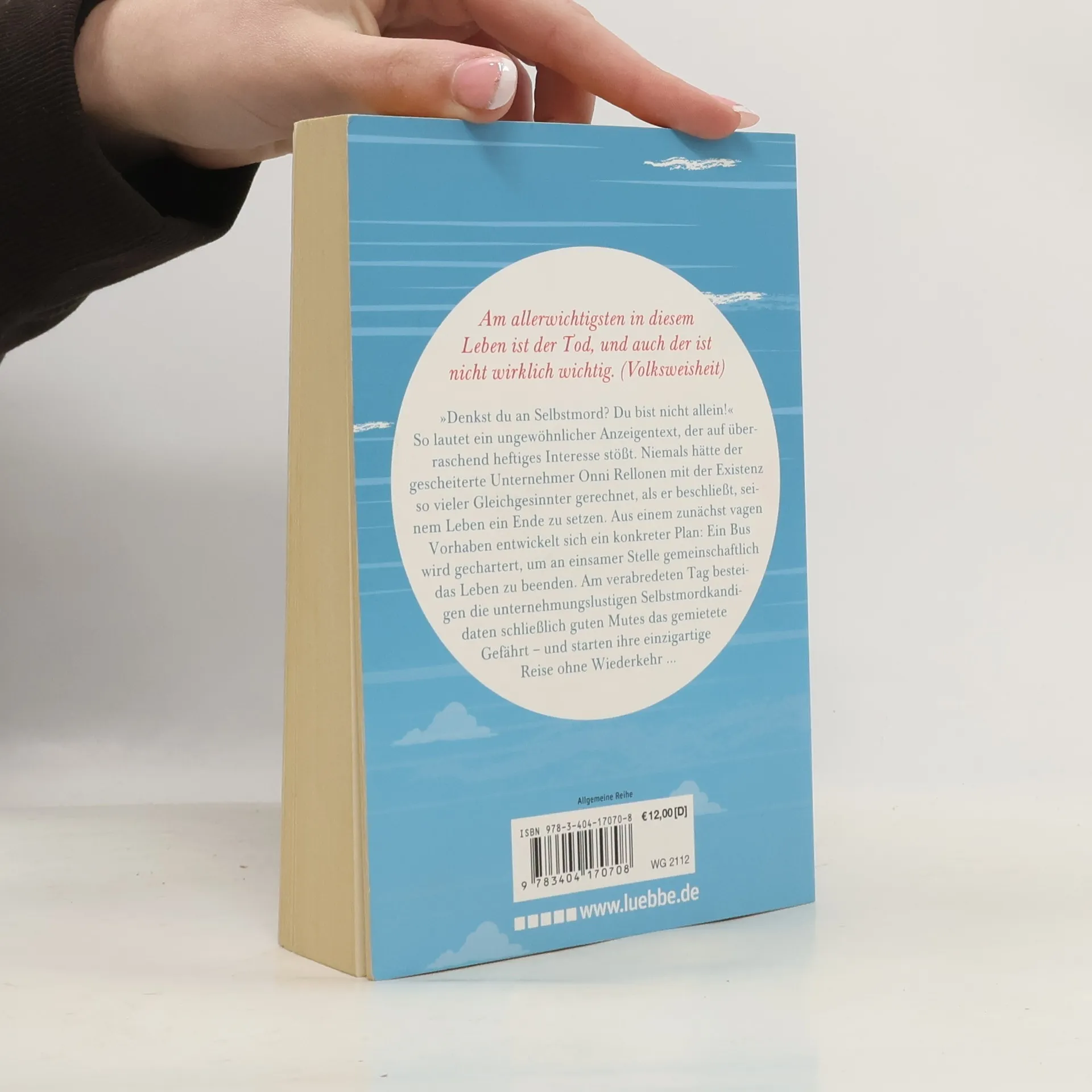 „Denkst du an Selbstmord? Du bist nicht allein!“ So lautet ein ungewöhnlicher Anzeigentext, der auf überraschend heftiges Interesse stößt. Niemals hätte der gescheiterte Unternehmer Onni Rellonen mit der Existenz so vieler Gleichgesinnter gerechnet, als er beschließt, seinem Leben ein Ende zu setzen. Aus einem zunächst vagen Vorhaben entwickelt sich ein konkreter Plan: Ein Bus wird gechartert, um an einsamer Stelle gemeinschaftlich das Leben zu beenden. Am verabredeten Tag besteigen die unternehmungslustigen Selbstmordkandidaten schließlich guten Mutes das gemietete Gefährt - und starten ihre einzigartige Reise ohne Wiederkehr ...