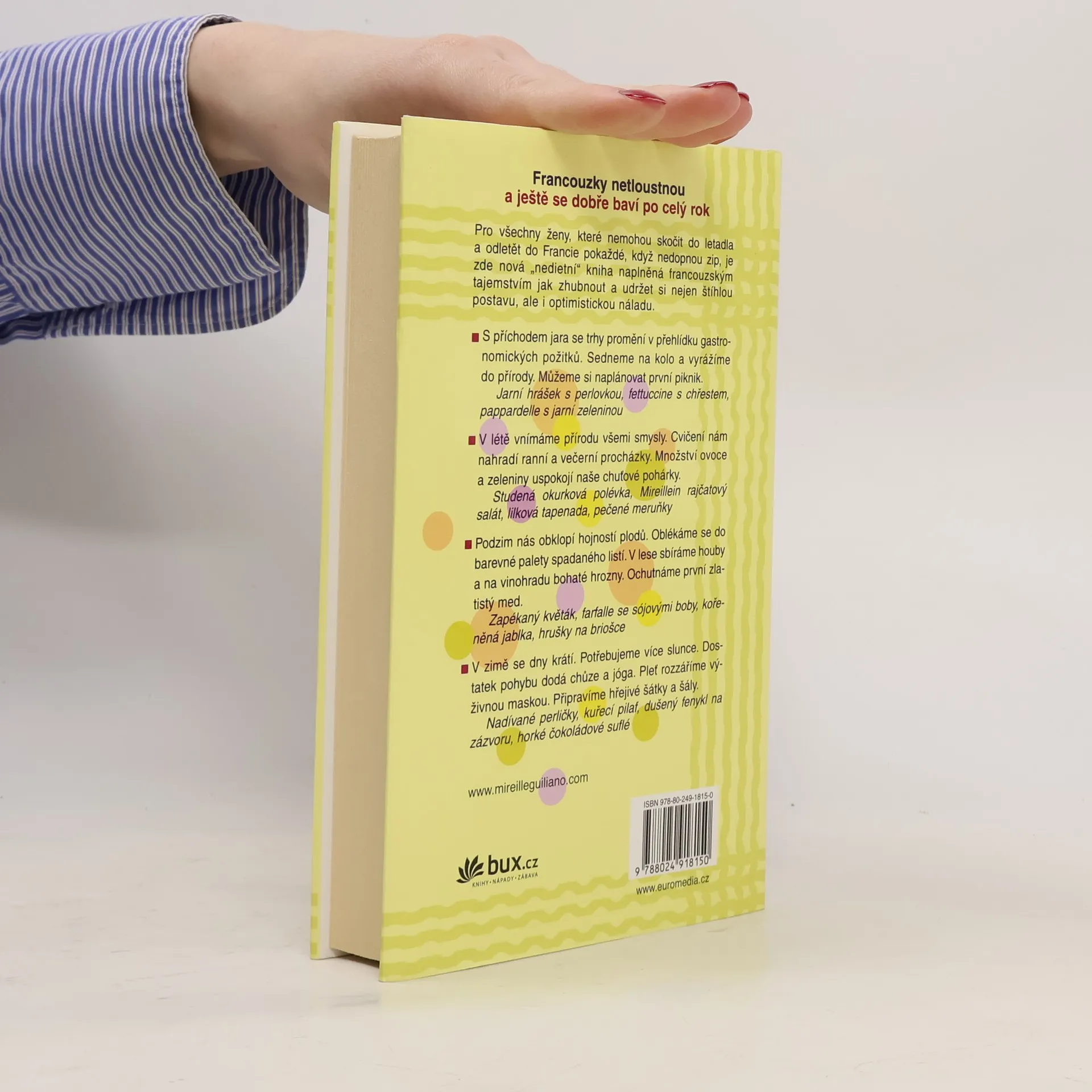 Tajemství, recepty a radůstky od jara do zimy Návody a rady ke snížení tělesné hmotnosti, k vytvoření zdravého a pohodového životního stylu podle vzoru francouzských žen. Změnit způsob myšlení a způsob stravování je nejdůležitější zásadou ke snížení váhy. Podle Francouzek je důležité vychutnat si požitek z jídla, nehladovět, jíst častěji a malé porce. Autorka provází ženy během jednoho roku, od jara od zimy, nabízí rady ke správnému stravování, ne striktní diety, které doplňuje různými tipy, recepty a jídelníčky, doporučuje a popisuje druhy vína a sýrů. Nejmocnější motivací ke snížení tělesné váhy jsou radost a spokojenost. V první knize "Francouzky netloustnou" autorka zasvětila čtenářky do základních prvků radosti ze života, zde učí ženy žít naplno.