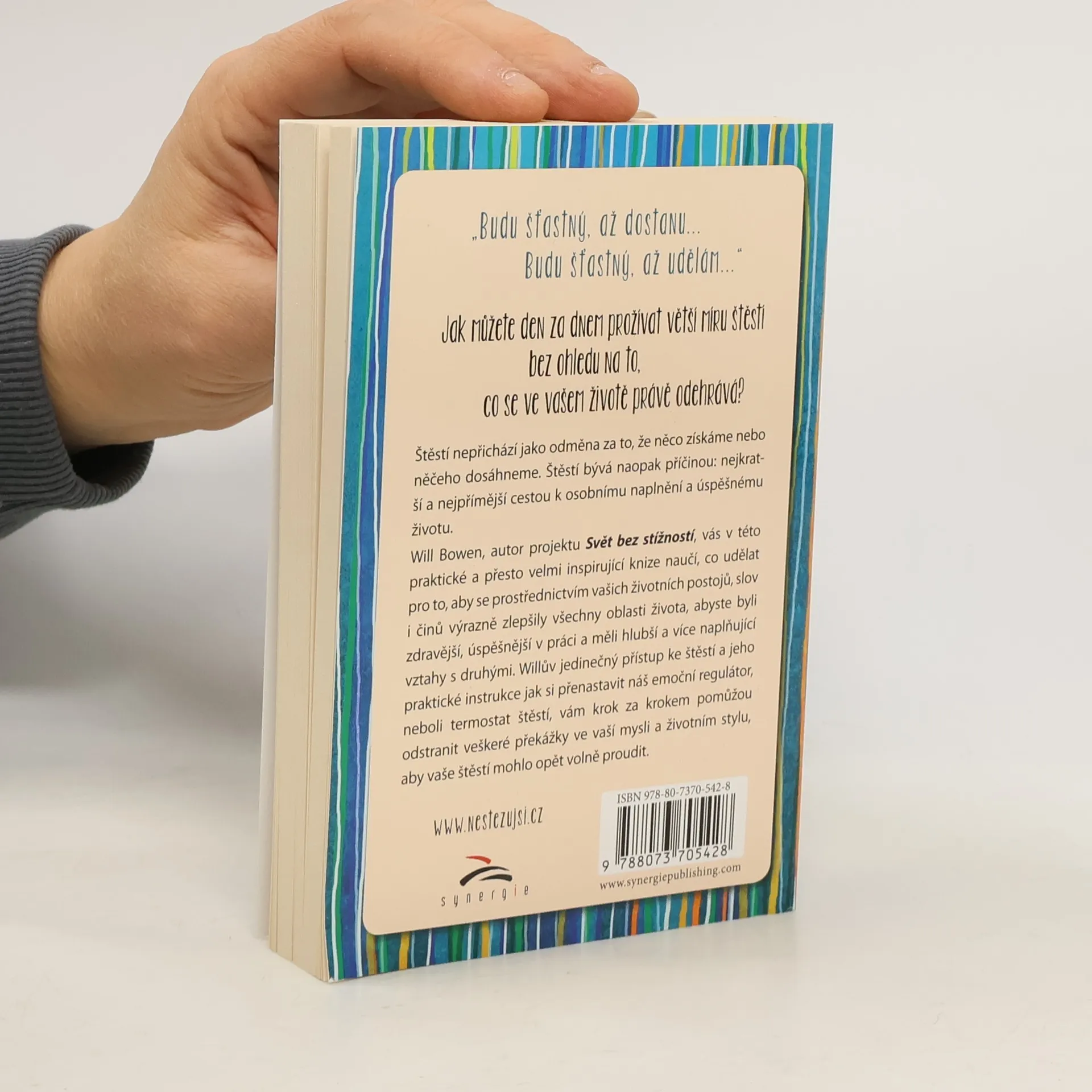 Jak můžete den za dnem prožívat větší míru štěstí bez ohledu na to, co se ve vašem životě právě odehrává? Štěstí nepřichází jako odměna za to, že něco získáme nebo něčeho dosáhneme. Štěstí bývá naopak příčinou: nejkratší a nejpřímější cestou k osobnímu naplnění a úspěšnému životu. Will Bowen, autor projektu Svět bez stížností, vás v této praktické a přesto velmi inspirující knize naučí, co udělat pro to, aby se prostřednictvím vašich životních postojů, slov i činů výrazně zlepšily všechny oblasti života, abyste byli zdravější, úspěšnější v práci a měli hlubší a více naplňující vztahy s druhými. Willův jedinečný přístup ke štěstí a jeho praktické instrukce jak si přenastavit náš emoční regulátor, neboli termostat štěstí, vám krok za krokem pomůžou odstranit veškeré překážky ve vaší mysli a životním stylu, aby vaše štěstí mohlo opět volně proudit.