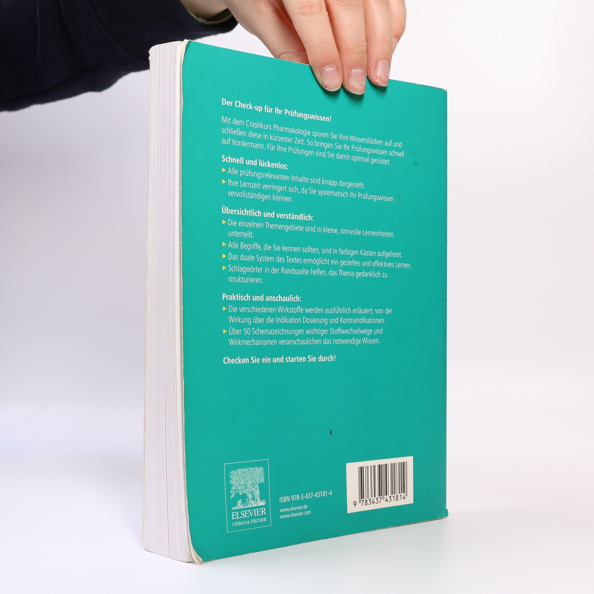 Der Check-up für Ihr Prüfungswissen! Mit dem Crashkurs Pharmakologie spüren Sie Ihre Wissenslücken auf und schließen diese in kürzester Zeit. So bringen Sie Ihr Prüfungswissen schnell auf Vordermann. Für Ihre Prüfungen sind Sie damit optimal gerüstet. Schnell und lückenlos: - Alle prüfungsrelevanten Inhalte sind knapp und stichpunktartig dargestellt. - Ihre Lernzeit verringert sich, da Sie systematisch Ihr Prüfungswissen vervollständigen können. Übersichtlich und verständlich: - Die einzelnen Themengebiete sind in kleine, sinnvolle Lerneinheiten unterteilt. - Alle Begriffe, die Sie kennen sollten, sind in farbigen Kästen aufgelistet. - Das duale System des Textes ermöglicht ein gezieltes und effektives Lernen. - Schlagwörter in der Randspalte helfen, das Thema gedanklich zu strukturieren. Praktisch und anschaulich: - Die verschiedenen Wirkstoffe werden ausführlich erläutert, von der Wirkung über die Indikation bis zu den Kontraindikationen - über 30 Schemazeichnungen wichtiger Stoffwechselwege und Wirkmechanismen Checken Sie ein und starten Sie durch! Von Studenten für Studenten!