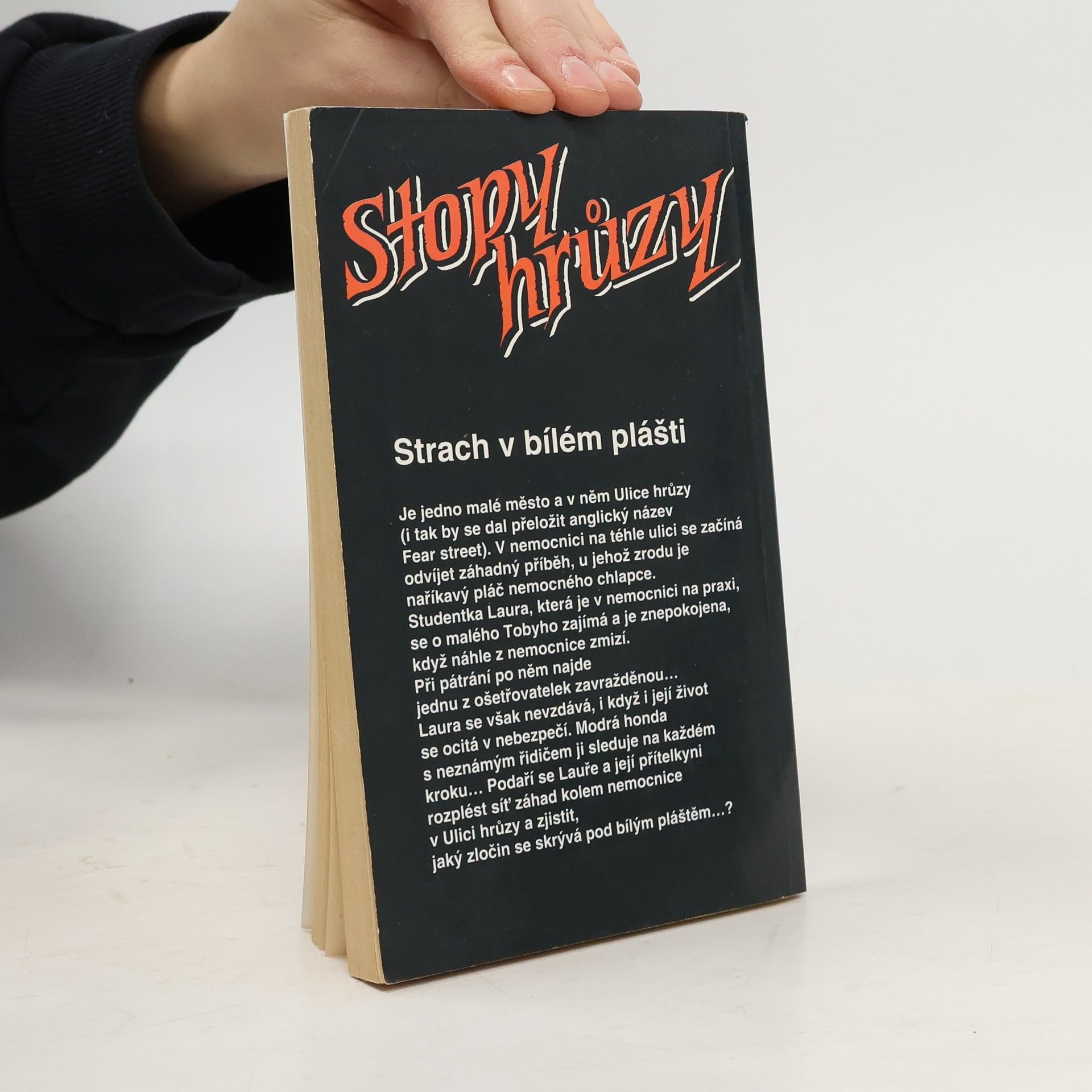 Je jedno malé město a v něm Ulice Hrůzy (i tak by se dal přeložit anglický název Fear Street). V nemocnici na téhle ulici se začíná odvíjet záhadný příběh, u jehož zrodu je naříkavý pláč nemocného chlapce. Studentka Laura, která je v nemocnici na praxi, se o malého Tobyho zajímá a je znepokojena, když náhle z nemocnice zmizí. Při pátrání po něm najde jednu z ošetřovatelek zavražděnou… Laura se však nevzdává, i když i její život se ocitá v nebezpečí. Modrá honda s neznámým řidičem ji sleduje na každém kroku… Podaří se Lauře a její přítelkyni rozplést síť záhad kolem nemocnice v Ulici Hrůzy a zjistit, jaký zločin se skrývá po bílým pláštěm…?... celý text