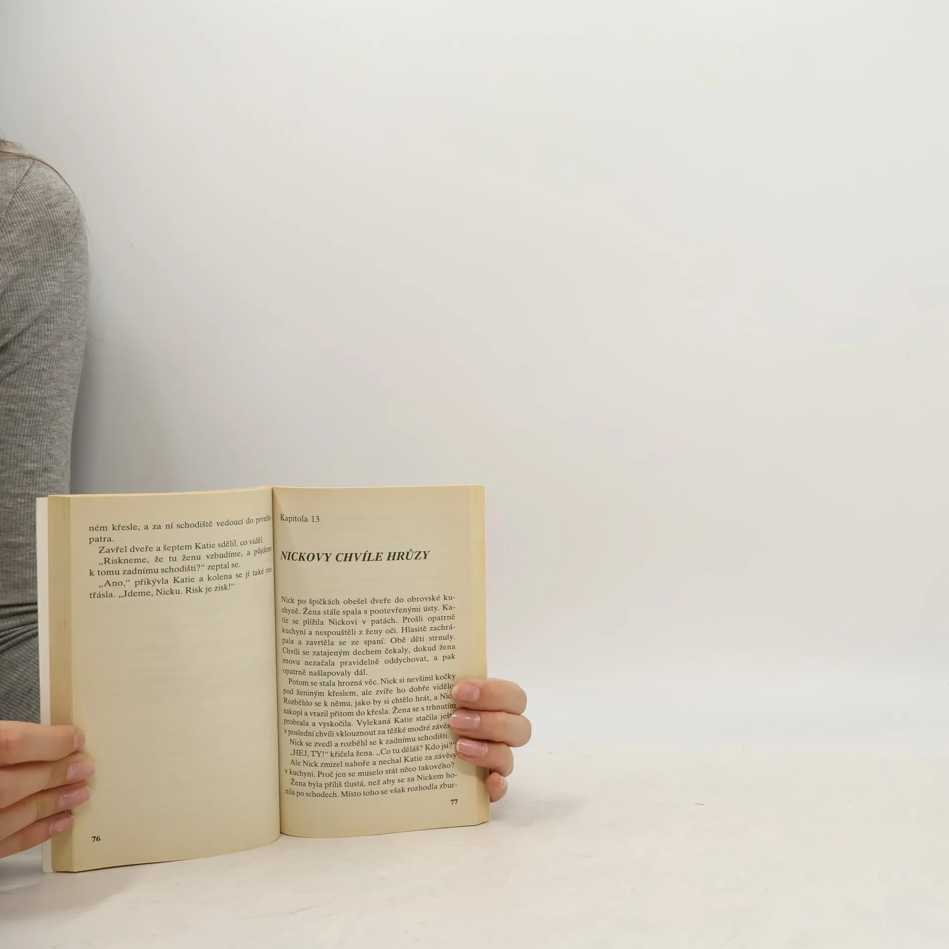 Nick po špičkách obešel dveře do obrovské kuchyně. Žena stále spala s polootevřenými ústy. Katie se plížila Nickovi v patách. Potom se stala hrozná věc. Nick si nevšiml kočky pod ženiným křeslem, ale zvíře ho dobře vidělo. Rozběhlo se se k němu, jako by si chtělo hrát, a Nick zakopl a vrazil přitom do křesla. Žena se strhnutím probudila a vyskočila. Vylekaná Katie stačila ještě v poslední chvíli uklouznout za těžké modré závěsy. Nick se zvedl a rozběhl se k zadnímu schodišti.