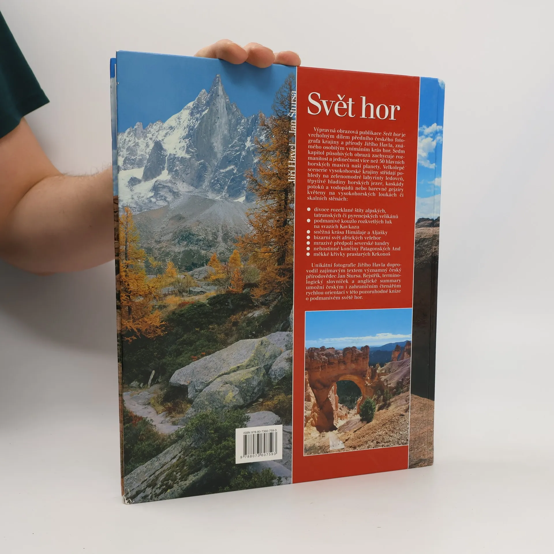 Výpravná obrazová publikace Svět hor je vrcholným dílem předního českého fotografa krajiny a přírody Jiřího Havla, známého osobitým vnímáním krás hor. Sedm kapitol působivých obrazů zachycuje rozmanitost a jedinečnost více než 50 hlavních horských masivů naší planety. Unikátní fotografie Jiřího Havla doprovodil zajímavým textem významný český přírodovědec Jan Štursa.