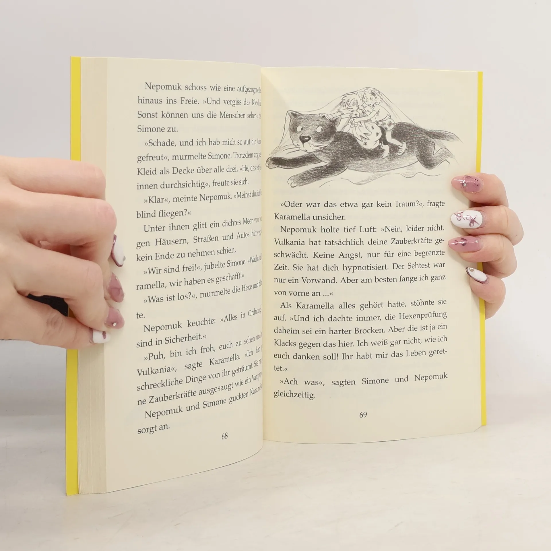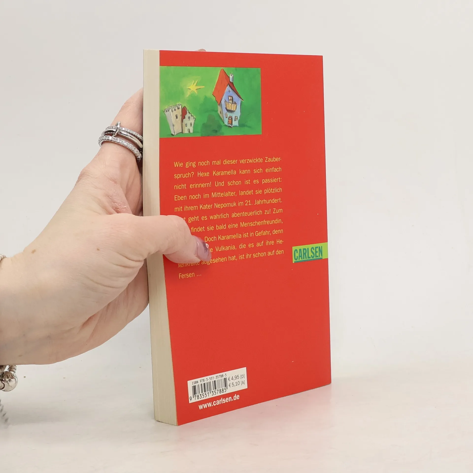 Das ganze Hexendorf ist in Aufruhr, denn alle Hexen sehen plötzlich schlecht. Und dann vergisst Karamella, die jüngste Hexe im Dorf, auch noch den entscheidenden Zauberspruch bei ihrer Hexenprüfung und landet mit ihrem Kater Nepomuk direkt im 21. Jahrhundert. Hier ist alles ganz anders als in ihrem Dorf, Karamella findet sich überhaupt nicht mehr zurecht. Zum Glück lernt sie Simone kennen, ein Menschenmädchen. Deren Hilfe kann sie gut gebrauchen, denn schon bald ist sie in die wildesten Abenteuer verstrickt.