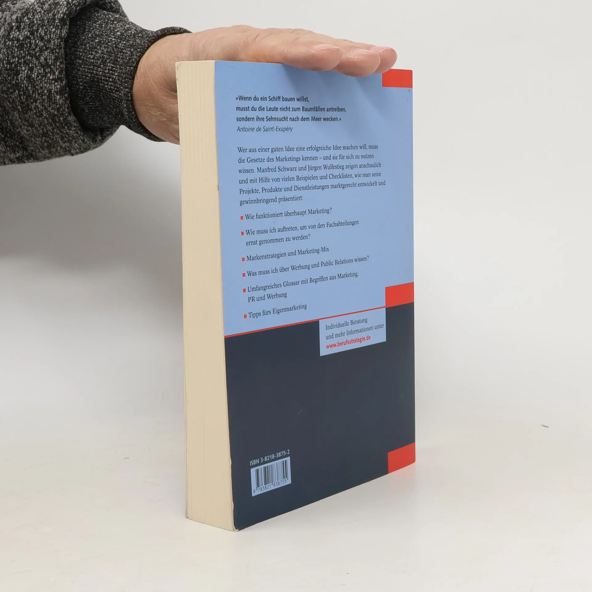 Gute Ideen reichen nicht! Sie müssen erfolgreich umgesetzt werden. Wer Marketing im Berufsalltag beherrscht, kennt das Instrumentarium., um seine Projekte innerhalb des Unternehmens erfolgreich zu vertreten. Er wird die Produkte oder Dienstleistungen der Firma gewinnbringend beim Kunden anbringen, innovativ denken und zielorientiert handeln - und nicht zuletzt die eigene Karriere erfolgreich nach vorne bringen. Der Autor zeigt anschaulich und mit Hilfe von vielen Beispielen und Checklisten, wie man die vielzitierte Marketing-Denke entwickelt: Wie funktioniert überhaupt Marketing? Wie muß ich auftreten, um von den Fachabteilungen ernst genommen zu werden? Markenstrategien und Marketing Mix Was muß ich über Werbung und Public Relations wissen? Glossar mit Begriffen aus Marketing, PR und Werbung Wenn du ein Schiff bauen willst, mußt du die Leute nicht zum Baumfällen antreiben, sondern ihre Sehnsucht nach dem Meer wecken. Antoine de Saint-Exupèry
