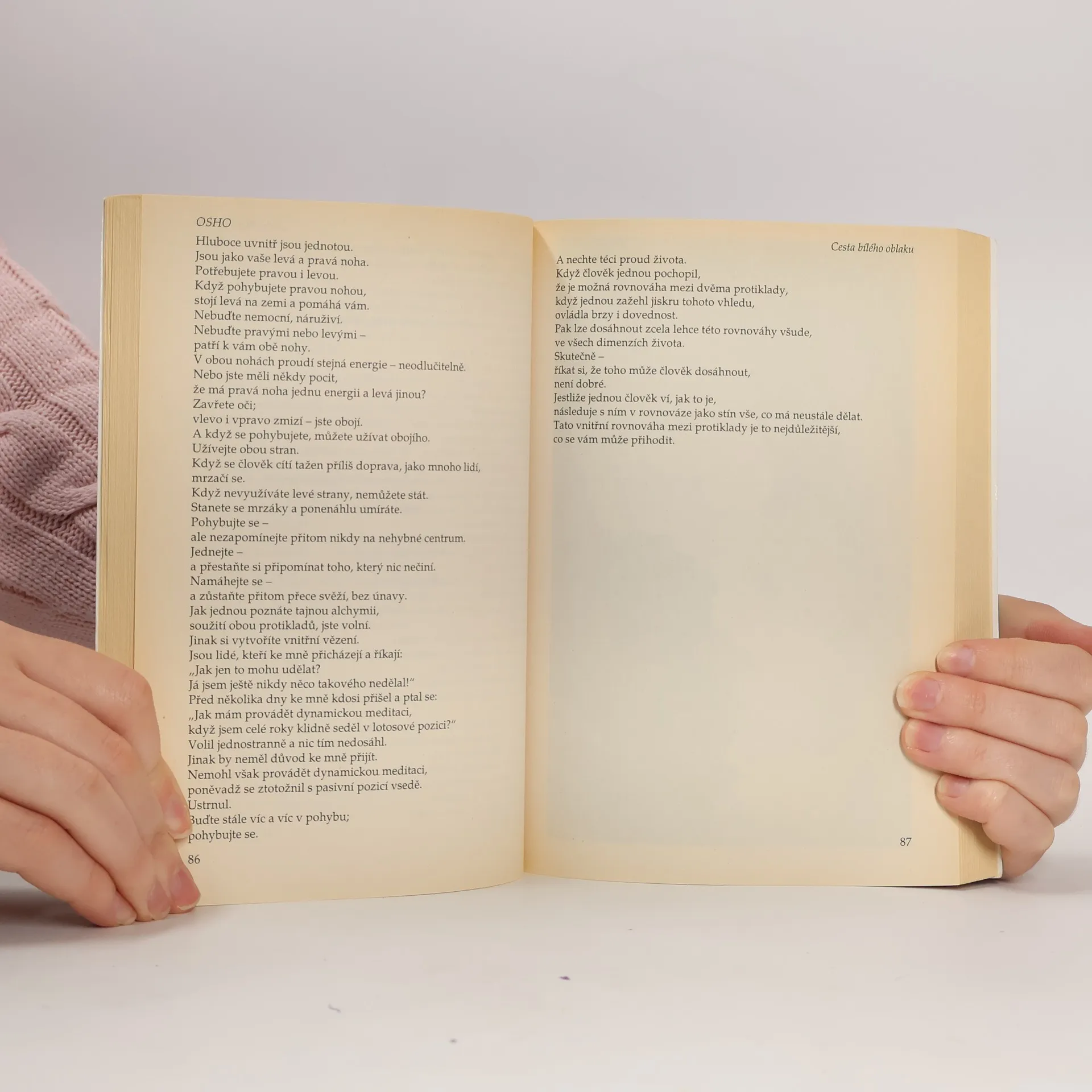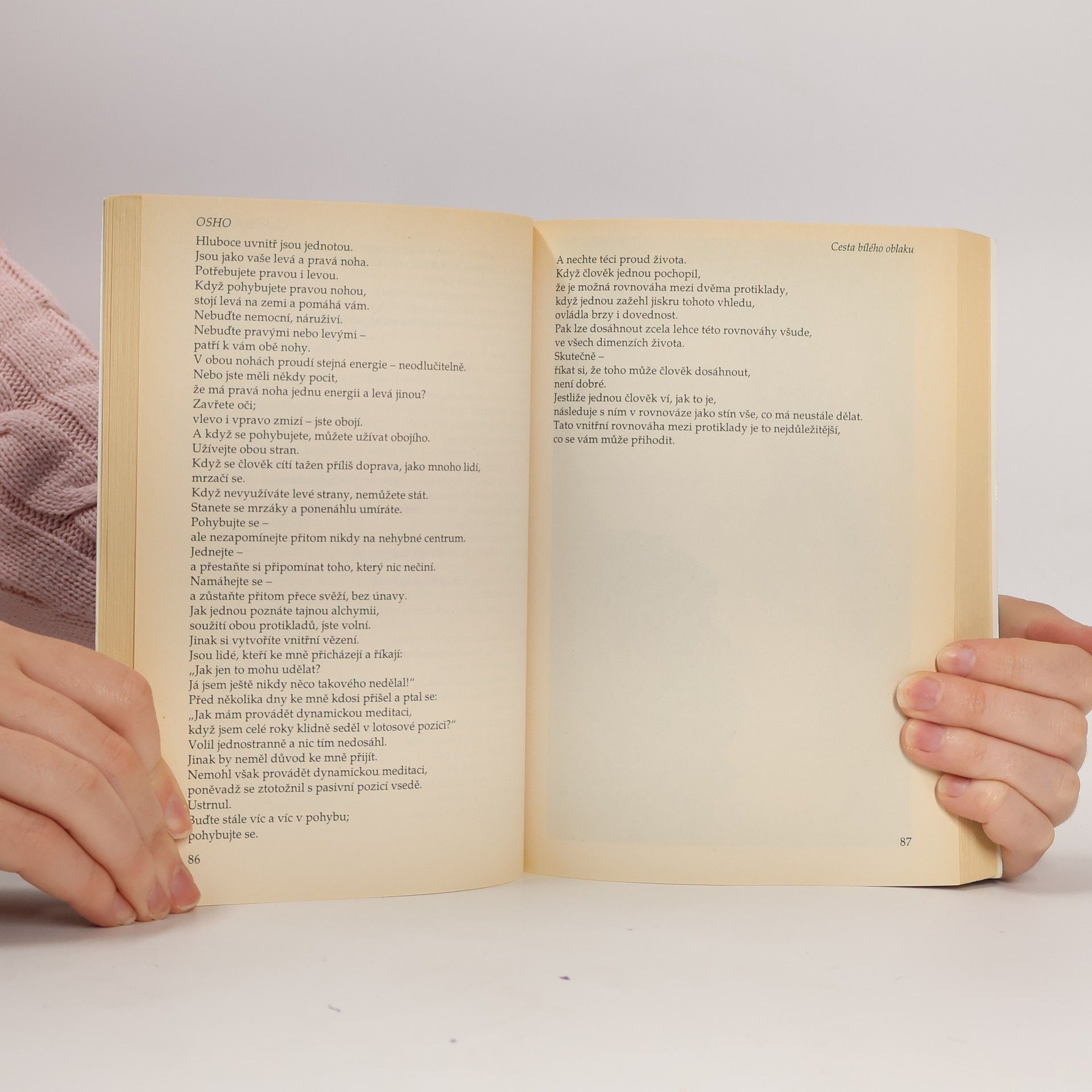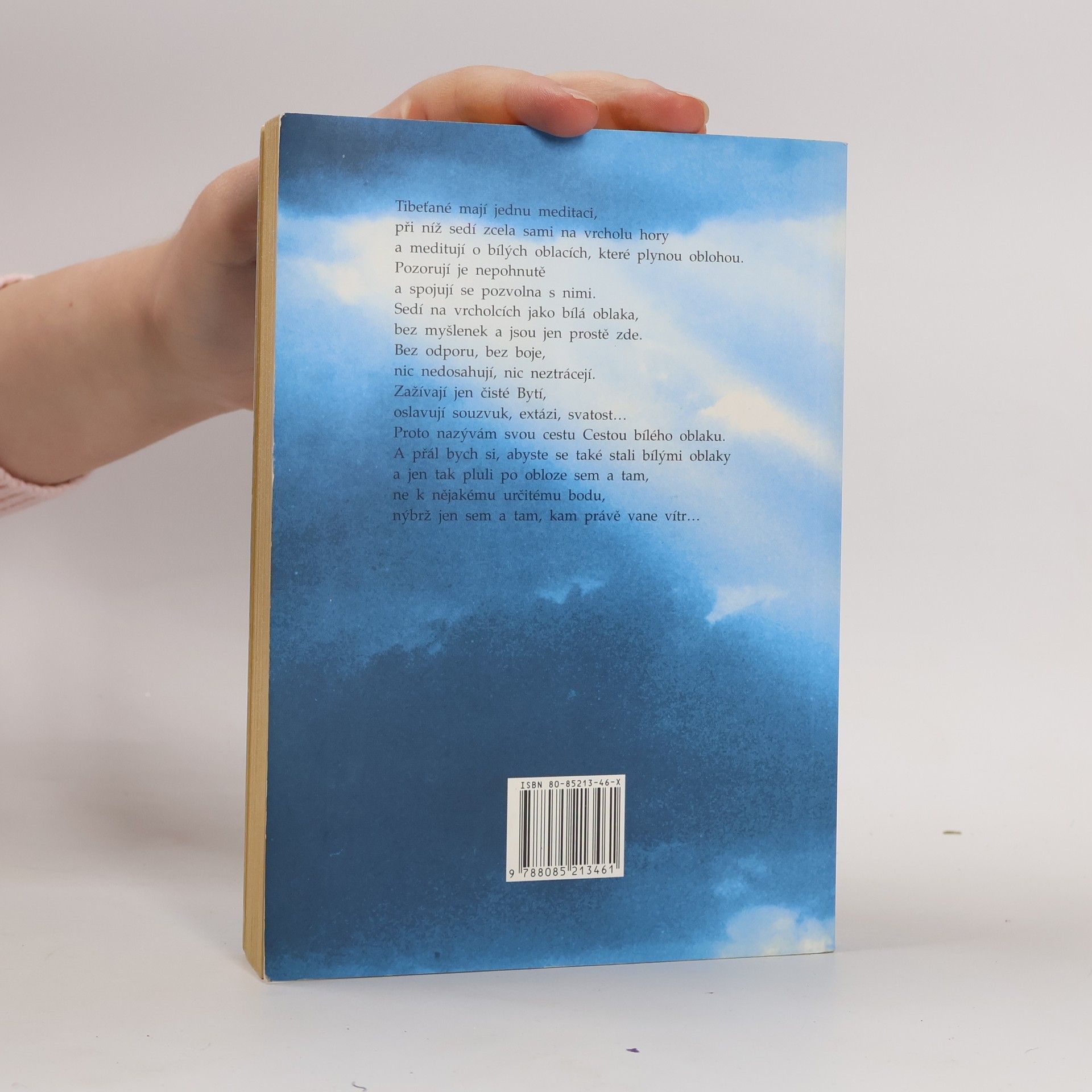 Tibeťané mají jednu meditaci, při níž sedí zcela sami na vrcholu hory a meditují o bílých oblacích, které plynou oblohou. Pozorují je nepohnutě a spojují se pozvolna s nimi. Sedí na vrcholcích jako bílá oblaka bez myšlenek a jsou jen prostě zde. Bez odporu, bez boje nic nedosahují, nic neztrácejí. Zažívají jen čisté Bytí, oslavují souzvuk, extázi, svatost ... Proto nazývám svou cestu Cestou bílého oblaku. A přál bych si, abyste se také stali bílými oblaky a jen tak pluli po obloze sem a tam, ne k nějakému určitému bodu, nýbrž jen sem a tam, kam právě vane vítr...... celý text