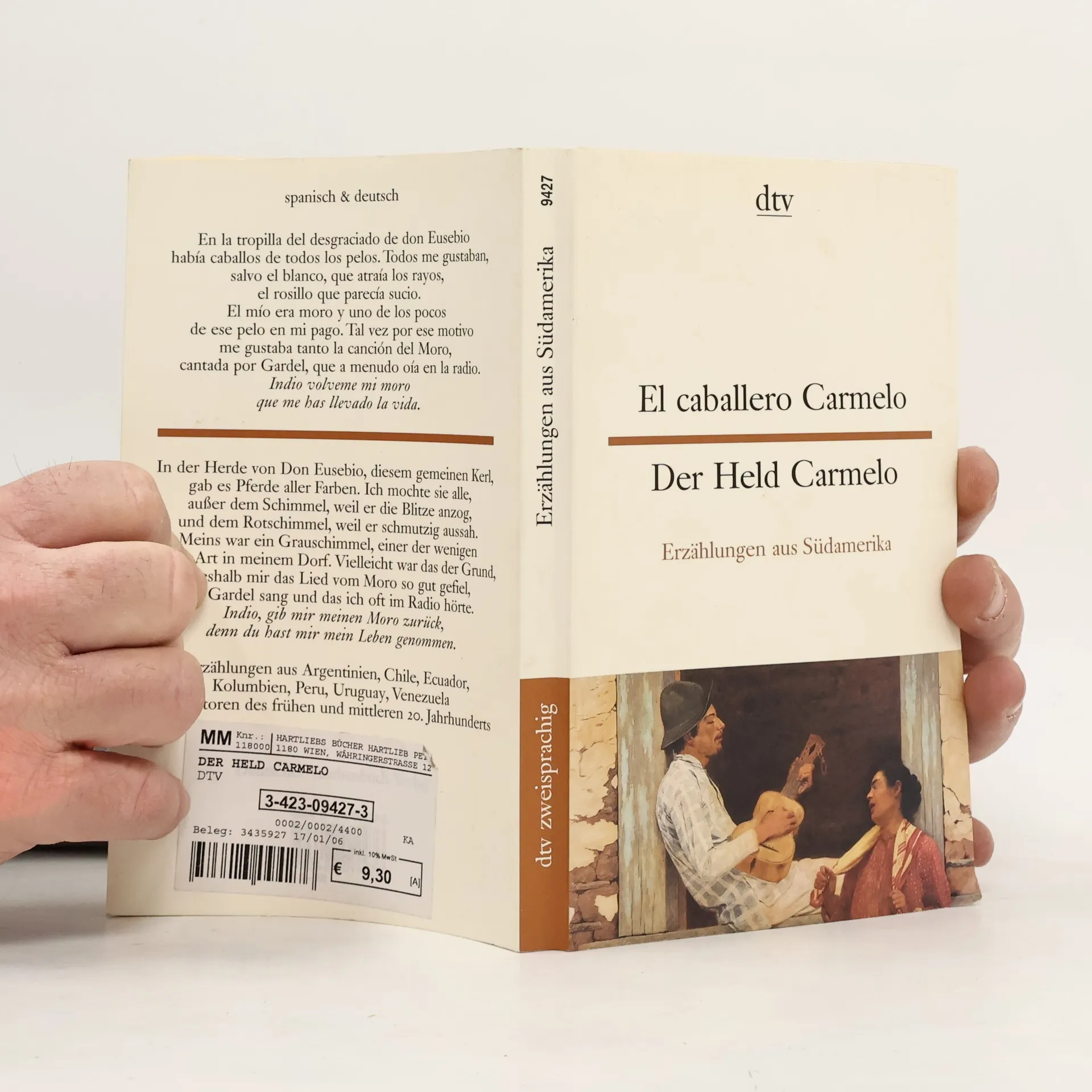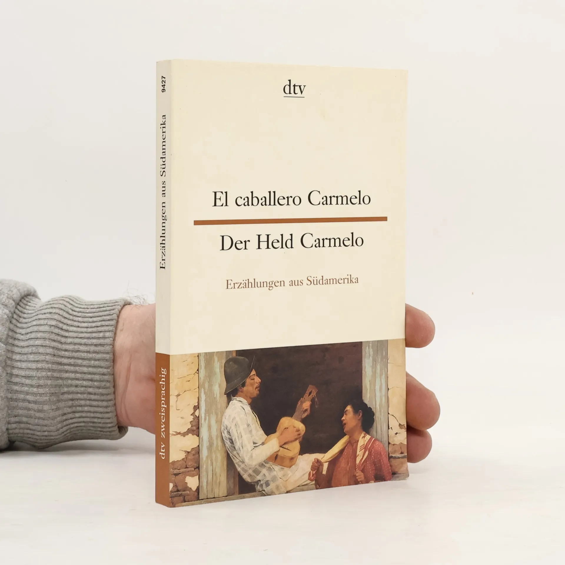 Der Held Carmelo - Erzählungen aus Südamerika Große Erzählkunst des 20. Jahrhunderts in spanisch-deutschem, Paralleldruck. Alles kommt vor: Großstadt, Dorfwelt, Liebe, Armut, Aberglaube, Edelmut, Gemeinheit, Leichtsinn, Rache, Tod. Zwölf Geschichten aus Südamerika in spanisch-deutschem Paralleldruck. Gallegos: Teufelsdämmerung Garmendia: Eladia Fuenmayor: Was ist das Leben? Téllez: Vorspiel Cuadra: Eine Krokodilgeschichte Palacio: Senora! Calderón: Die Stecknadel Valdelomar: Der Held Carmelo Bombal: Der Baum Borges: Die Münze Ocampo: Der Grauschimmel Onetti: Zurück in den Süden