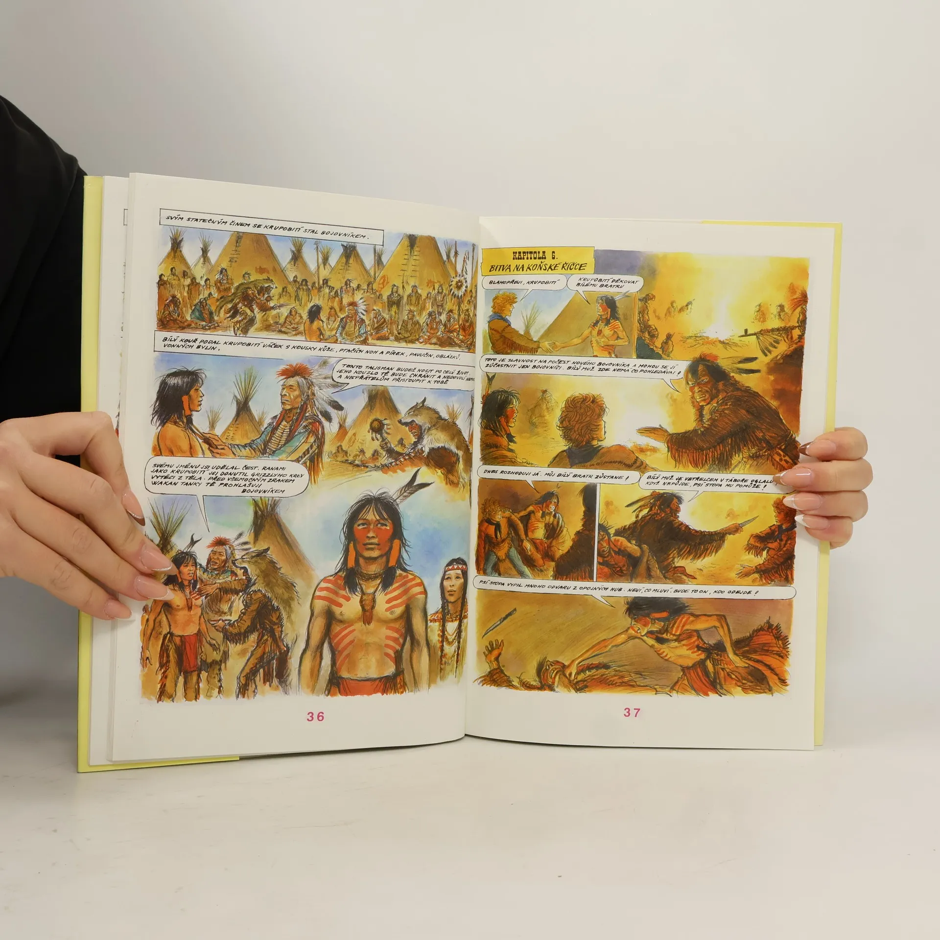 Dobrodružství na Oregonské stezce. Kreslený román z Divokého západu, který napínavým dějem přibližuje historiské události na Oregonské stezce, kde vrcholí boj Indiánů o jejich práva. Hrdiny příběhu jsem dva chlapci, idiánský chlapec Krupobití a bělošský chlapec Dick Thompson, kteří se spřátelí za dramatických okolností. Jejich kamarádství je vystaveno četným zkouškám. Prožívají spolu i všední dny v indiánské vesnici, kdy Dick objevuje dobré i špatné stránky indiánské života... Jejich cesty se ovšem rozdělí, ale události je po čase opět svedou dohromady, ale každý už stojí na jiné straně a hájí zájmy své rasy...... celý text