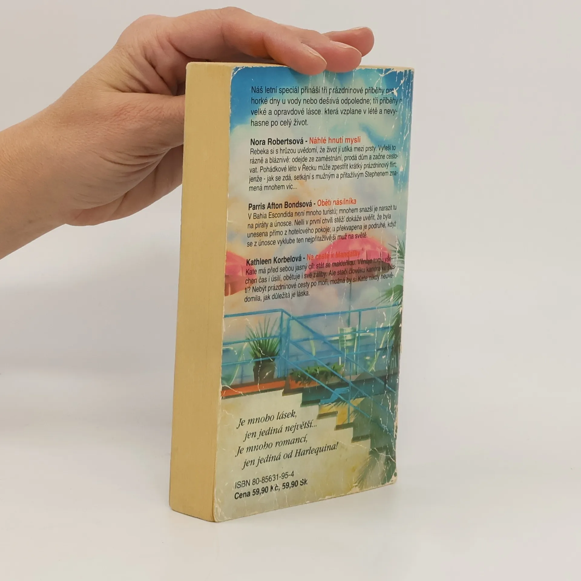 Náhlé hnutí mysli - Nora Roberts Rebeka si s hrůzou uvědomí, že život jí utíká mezi prsty. Vyřeší to rázně a bláznivě: odejde ze zaměstnání. Prodá dům a začne cestovat. Pohádkové léto v Řecku může zpestřit krátký prázdninový flirt, jenže – jak se zdá, setkání s mužným a přitažlivým Stephenem znamená mnohem víc. Obětí násilníka - Parris Afton Bonds V Bahia Escondida není mnoho turistů, mnohem snazší je narazit tu na piráty a únosce. Nelli v první chvíli stěží dokáže uvěřit, že byla unesena přímo z hotelového pokoje; a překvapena je podruhé, když se z únosce vyklube ten nejpřitažlivější muž na světě. Na cestě do Mandalay - Kathleen Korbel Kate má před sebou jasný cíl; stát se makléřkou. Věnuje tomu všechen čas i úsilí, obětuje i své záliby. Ale stačí člověku kariéra ke štěstí? Nebýt prázdninové cesty po moři, možná by si Kate nikdy neuvědomila, jak důležitá je láska.