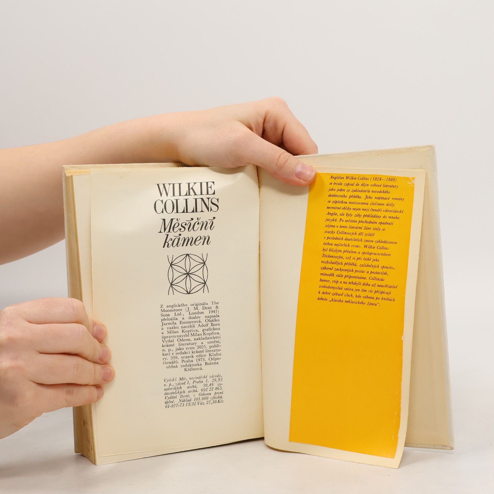 Detektivní román anglického klasika líčí osudy lidí, kteří přišli do styku s velkým žlutým diamantem, uloupeným s čela indického bůžka, zosobňujícího měsíc. Dramatické momenty jsou protkány známým anglickým suchým humorem, parodujícím společenskou přetvářku a mravy hrabivých kolonisátorů.