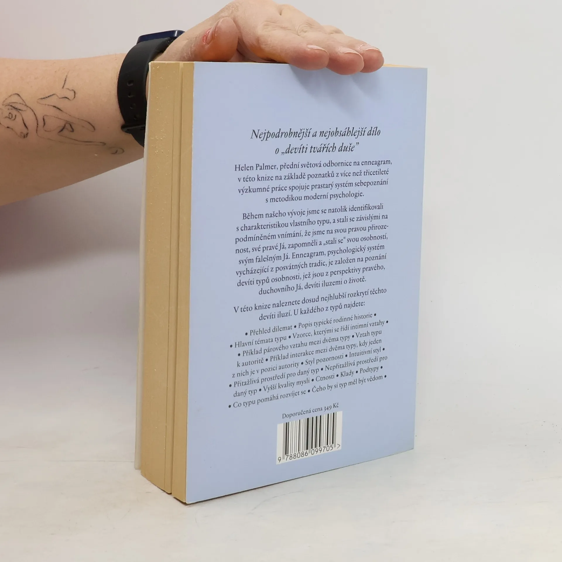 Helen Palmer, přední světová odbornice na enneagram, v této knize na základě poznatků z více než třicetileté výzkumné práce spojuje prastarý systém sebepoznání s metodikou moderní psychologie. Během našeho vývoje jsme se natolik identifikovali s charakteristikou vlastního typu, a stali se závislými na podmíněném vnímání, že jsme na svou pravou přirozenost, své pravé Já, zapomněli a „stali se“ svou osobností, svým falešným Já. Enneagram, psychologický systém vycházející z posvátných tradic, je založen na poznání devíti typů osobnosti, jež jsou z perspektivy pravého, duchovního Já, devíti iluzemi o životě. V této knize naleznete dosud nejhlubší rozkrytí těchto devíti iluzí. U každého z typů najdete: Přehled dilemat - Popis typické rodinné historie - Hlavní témata typu - Vzorce, kterými se řídí v intimních vztazích - Příklad párového vztahu mezi dvěma typy - Vztah typu k autoritě - Příklad interakce mezi dvěma typy, kdy jeden z nich je v pozici autority - Styl pozornosti - Intuitivní styl - Přitažlivá prostředí pro daný typ - Nepřitažlivá prostředí pro daný typ - Vyšší kvality mysli - Ctnosti - Klady - Podtypy - Co typu pomáhá rozvíjet se - Čeho by si typ měl být vědom.