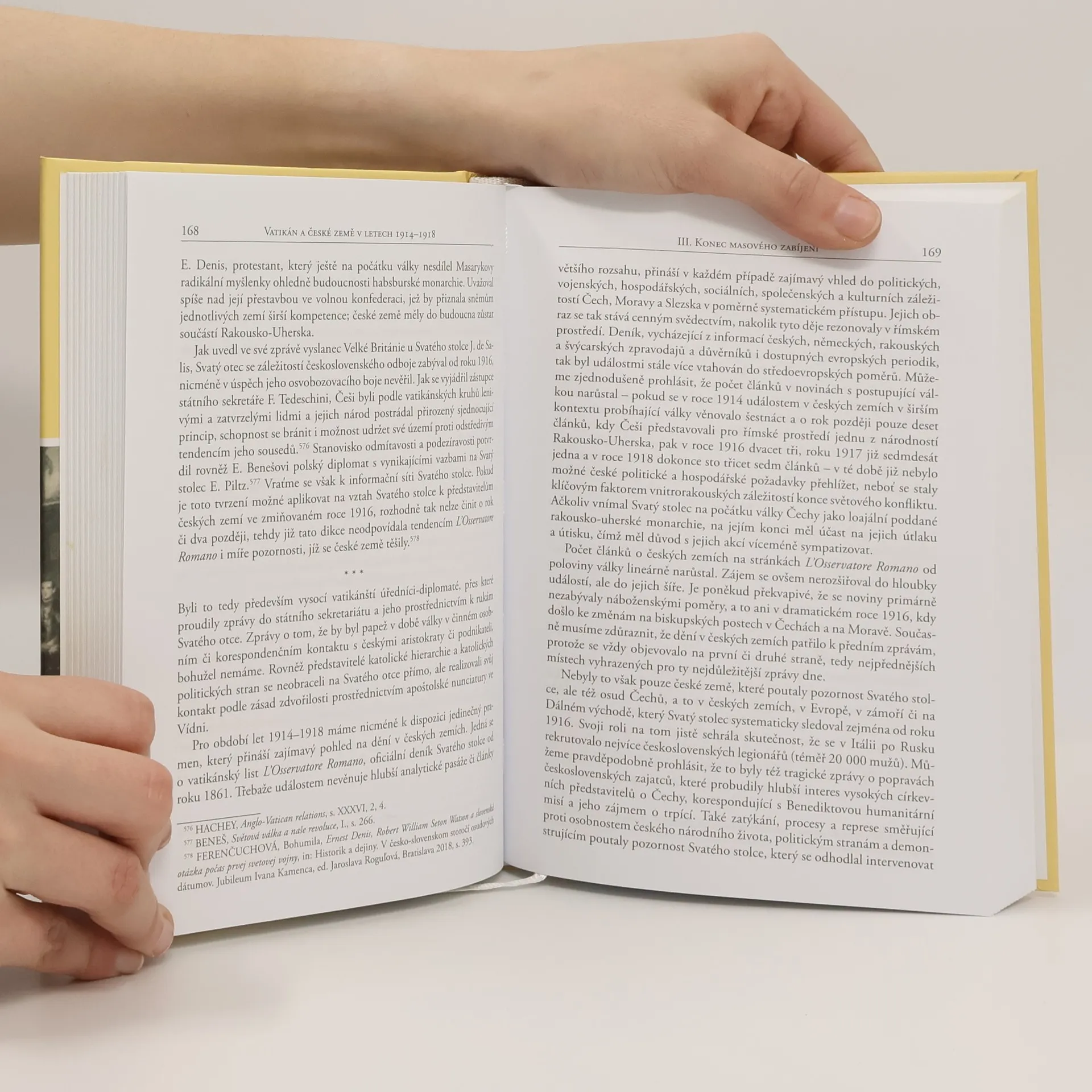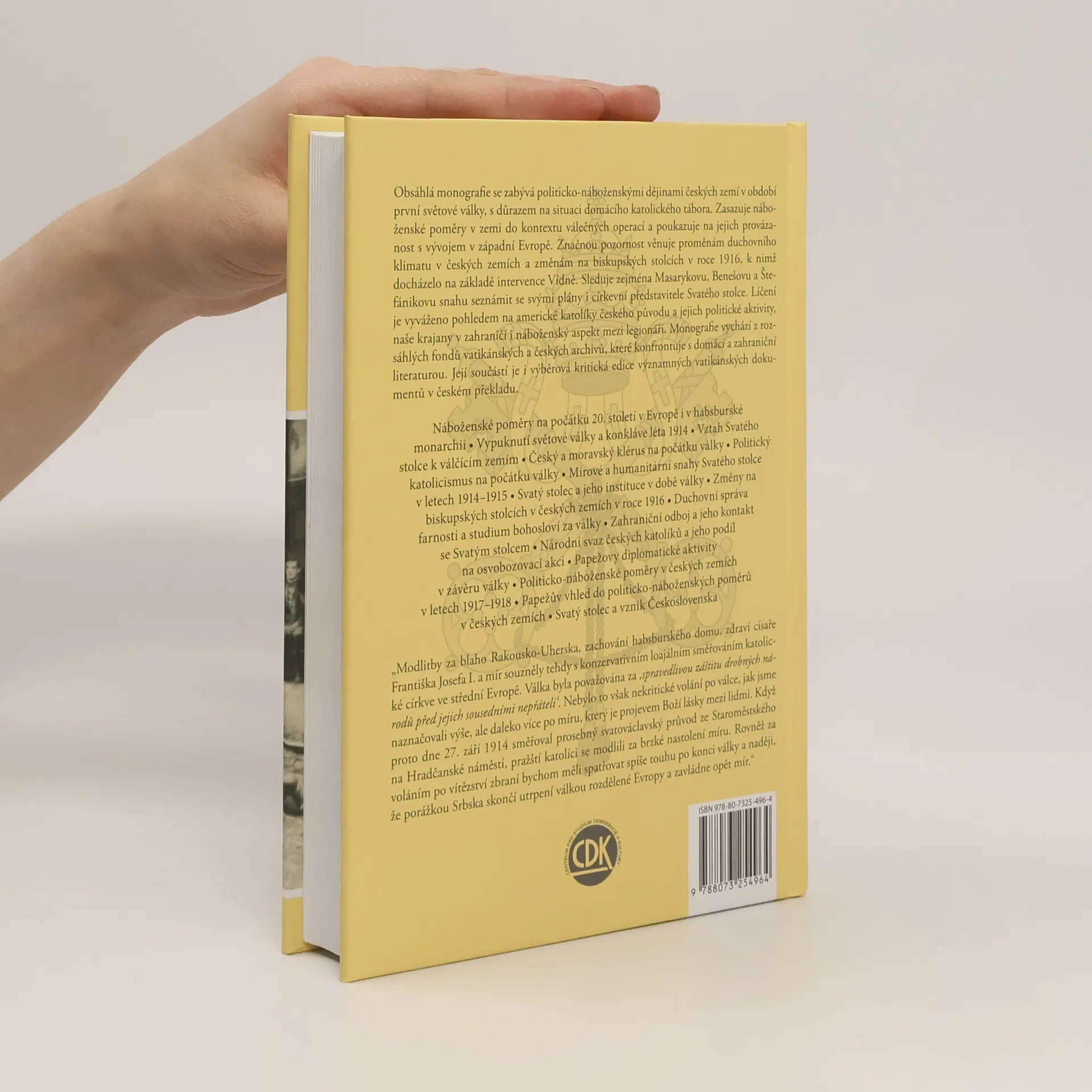 Obsáhlá monografie se zabývá politicko náboženskými dějinami českých zemí v období první světové války, s důrazem na situaci domácího katolického tábora. Zasazuje náboženské poměry v zemi do kontextu válečných operací a poukazuje na jejich provázanost s vývojem v západní Evropě. Značnou pozornost věnuje proměnám duchovního klimatu v českých zemích a změnám na biskupských stolcích v roce 1916, k nimž docházelo na základě intervence Vídně. Sleduje zejména Masarykovu, Benešovu a Štefánikovu snahu seznámit se svými plány i církevní představitele Svatého stolce. Líčení je vyváženo pohledem na americké katolíky českého původu a jejich politické aktivity, naše krajany v zahraničí i náboženský aspekt mezi legionáři. Monografie vychází z rozsáhlých fondů vatikánských a českých archivů, které konfrontuje s domácí a zahraniční literaturou. Její součástí je i výběrová kritická edice významných vatikánských dokumentů v českém překladu.