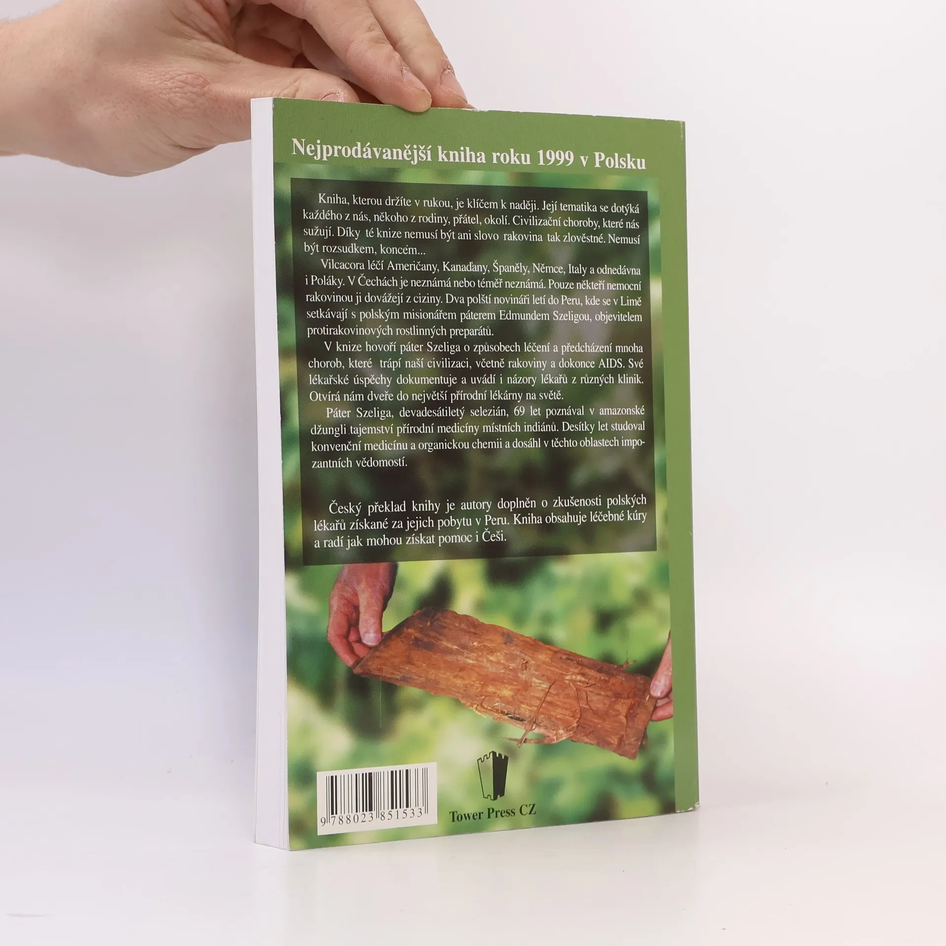 Výklady o protirakovinovém působení tropické liany vilcacora a jejím propagátorovi, polském misionáři Szeligovi. Kniha je klíčem k naději. Její tematika se dotýká každého z nás, někoho z rodiny, přátel, okolí. Civilizační choroby, které nás sužují. Díky té knize nemusí být ani slovo rakovina tak zlověstné. Nemusí být rozsudkem, koncem... Dva polští novináři letí do Peru, kde se v Limě setkávají s polským misionářem páterem Edmundem Szeligou, objevitelem protirakovinových rostlinných preparátů. V knize hovoří páter Szeliga o způsobech léčení a předcházení mnoha chorob, které trápí naší civilizaci, včetně rakoviny a dokonce AIDS. Své lékařské úspěchy dokumentuje a uvádí i názory lékařů z různých klinik. Otvírá nám dveře do největší přírodní lékárny na světě. Páter Szeliga poznával 69 let v amazonské džungli tajemství přírodní medicíny místních indiánů. Desítky let studoval konvenční medicínu a organickou chemii a dosáhl v těchto oblastech impozantních vědomostí. Český překlad knihy je doplněn o zkušenosti polských lékařů získané za jejich pobytu v Peru. Kniha obsahuje léčebné kúry a radí jak mohou získat pomoc i Češi.... celý text