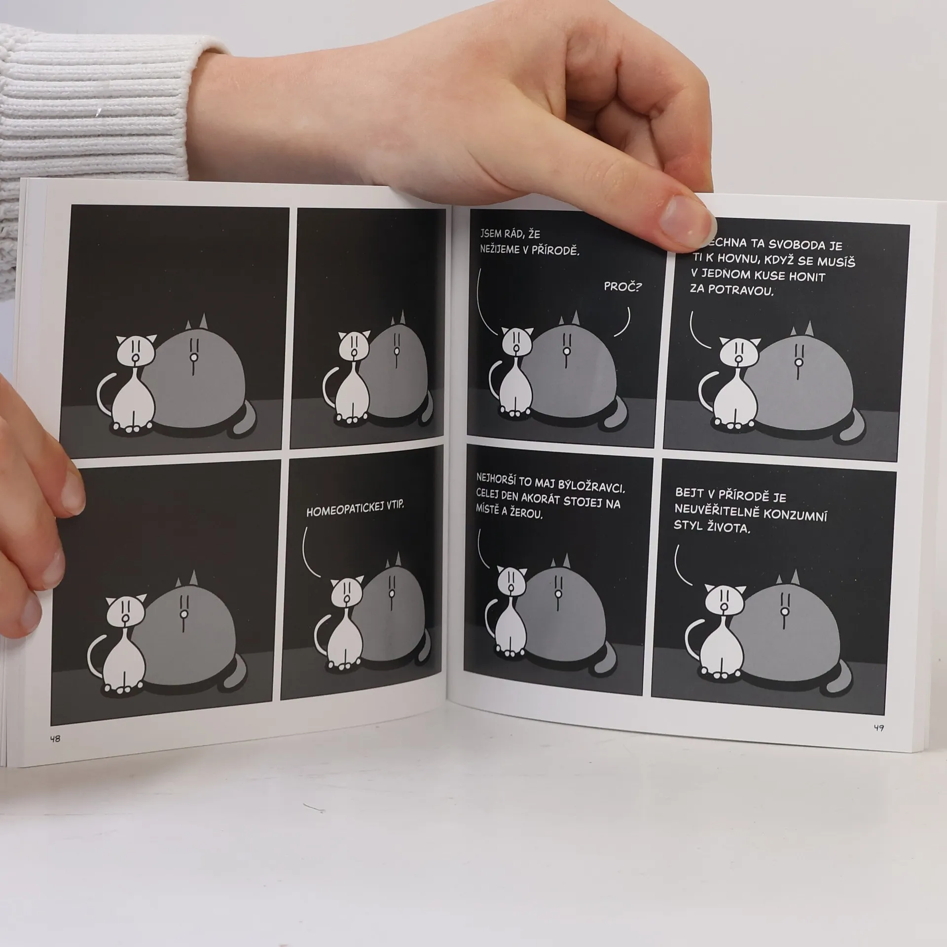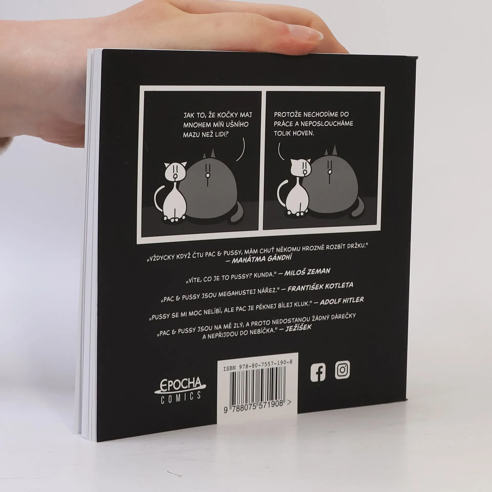 Víte, co je to Pussy? Teda Pac a Pussy? Pokud ne, pak vězte, že jde o dvě kočky z Facebooku, kde udělaly kariéru jako sarkastické existencialistické mrchy, které máte chuť umazlit k smrti. Úderné, nestydatě zábavné, ale zároveň vypovídající o podstatě života, vesmíru a smyslu existence misky na kočičí žrádlo. Poprvé na papíře a s hromadou bonusů, které se na Facebooku neobjevily a nikdy ani neobjeví. Knihu můžete navíc využít jako podestýlku pro křečka, ubalit si z ní cigarety nebo ji dát na hraní kočkám. Dnes jeden z českých kultovních webkomiksů Pac & Pussy vznikl v roce 2017 na Facebooku. Stál za ním reklamní textař a muzikant Albrecht Smuten, který udržel ďábelské tempo publikovat dvakrát týdně nový strip. Dvě kočky komentující otázky života, smrti, duchovna i běžných lidských starostí z pohledu koček se staly okamžitě fenoménem, který obletěl Facebook tam a zpátky. Jejich humor totiž nestojí na komentování aktuálních a tedy pomíjivých událostí, ale na úvahách, které dřív nebo později napadnou každého. Pac & Pussy ovšem témata našich životů brát s černým humorem a nadhledem, který je nejen nadčasový, ale dostane každého a ve své kategorii tak v Česku nemá srovnání. Nejvíc knihu, samozřejmě, ocení majitelé koček, protože podstatná část humoru Pac & Pussy se týká života koček a jejich specifického vztahu k lidem a světu.