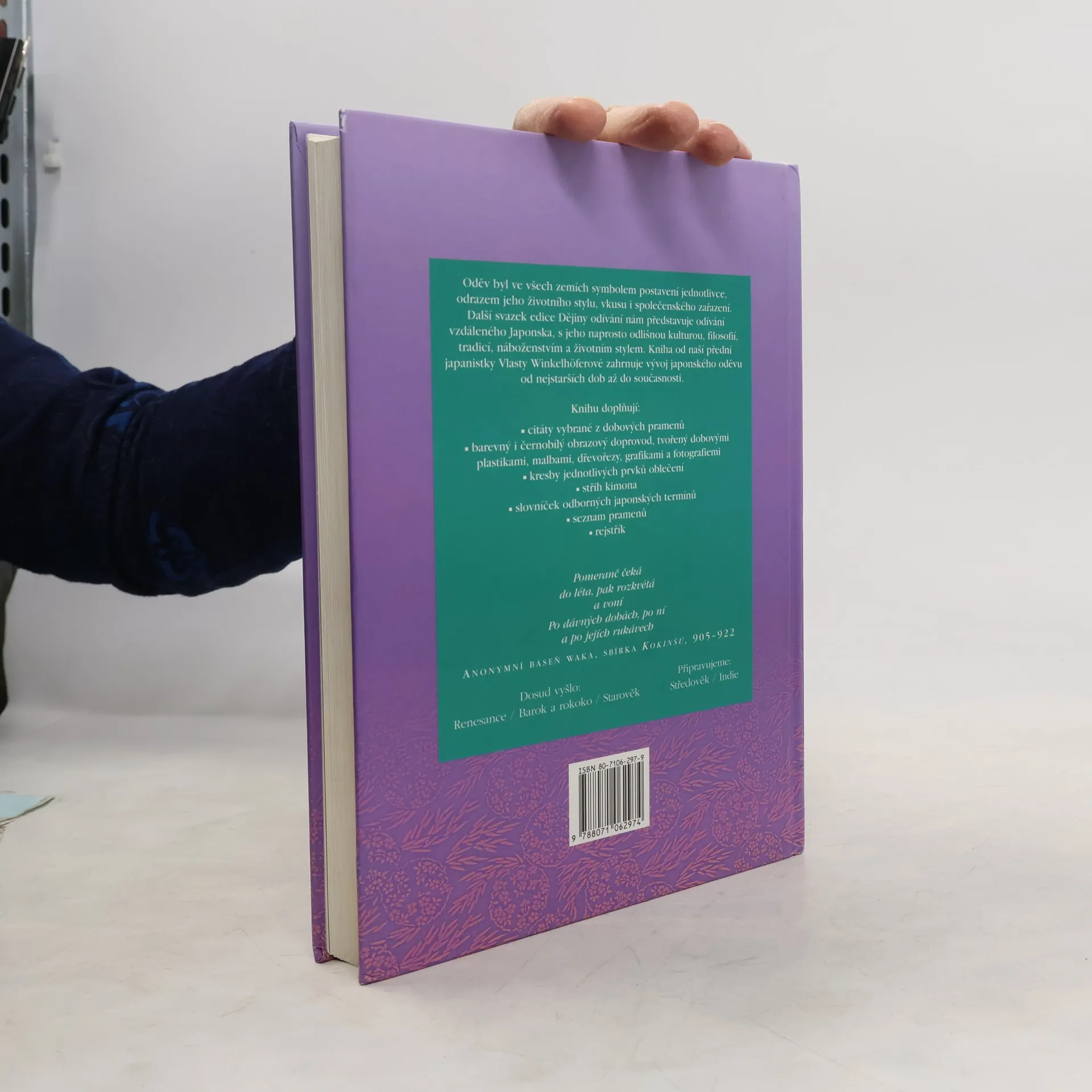Čtvrtý svazek souboru o dějinách odívání je věnován japonské oděvní kultuře od doby prehistorické až po současnost. Kniha známé české japanistky sleduje vývoj japonského odívání jako součást japonské kultury, životního stylu a filozofie. Zabývá se také významem oděvu pro vyjádření společenského postavení. V souvislosti s tím autorka probírá i japonské šperkařství, kosmetiku, účesy a způsob oblékání tradičních japonských oděvů. Doplněno množstvím kvalitních barevných fotografií i reprodukcemi obrazů a grafik, které se týkají tématu. Na závěr je připojen slovníček japonských termínů z oblasti odívání a textilu.
