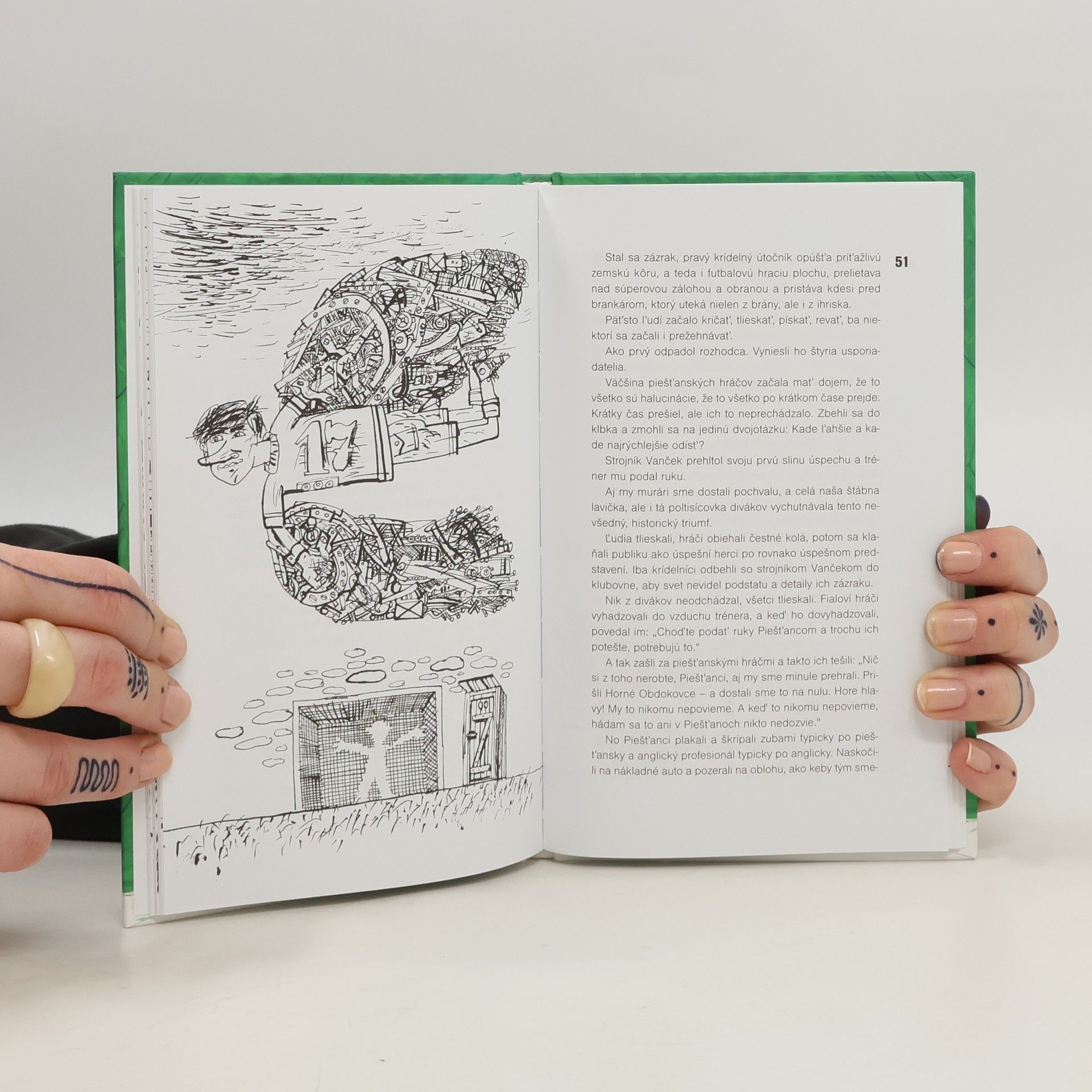 Krátka novela, rozprávanie o zlatých časoch dedinského futbalu, keď sa chlapi naháňali po ihrisku za loptou, a nie za peniazmi. Mystifikačný príbeh opierajúci sa o chlapčenské autorove zážitky, napísaný hravo, vtipne, groteskne rozvíjajúci obrazný jazyk futbalu do epických situácií. Autorov text dopĺňajú ilustrácie Svetozára Mydlu rezonujúce so štepkovskou poetikou.