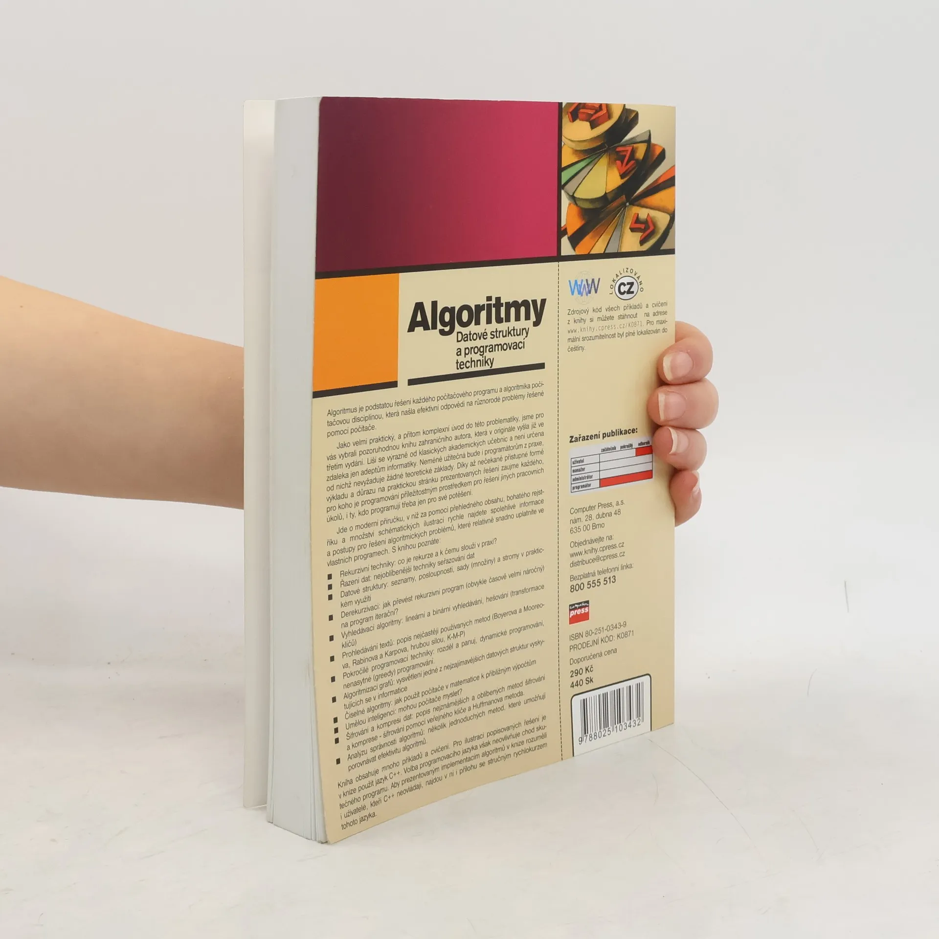 Algoritmus je klíčem k řešení počítačových programů a algoritmika nabízí efektivní odpovědi na různé problémy. Tento komplexní a praktický úvod do problematiky je určen nejen studentům informatiky, ale i praktikujícím programátorům, kteří nemusejí mít teoretické základy. Díky přístupnému výkladu a důrazu na praktické aplikace zaujme každého, kdo programuje pro pracovní úkoly či pro zábavu. Kniha obsahuje přehledný obsah, bohatý rejstřík a množství ilustrací, které usnadňují nalezení informací a postupů pro řešení algoritmických problémů. Čtenáři se seznámí s rekurzivními technikami, oblíbenými metodami řazení dat, praktickým využitím datových struktur jako seznamy a stromy, a naučí se, jak převést rekurzivní programy na iterativní. Dále pokrývá vyhledávací algoritmy, metody pro prohledávání textů, pokročilé programovací techniky, algoritmizaci grafů, číselné algoritmy, umělou inteligenci, šifrování a kompresi dat, a analýzu správnosti algoritmů. Kniha obsahuje množství příkladů a cvičení, přičemž pro ilustraci je použit jazyk C++. Pro čtenáře, kteří C++ neovládají, je k dispozici příloha se stručným rychlokurzem tohoto jazyka.