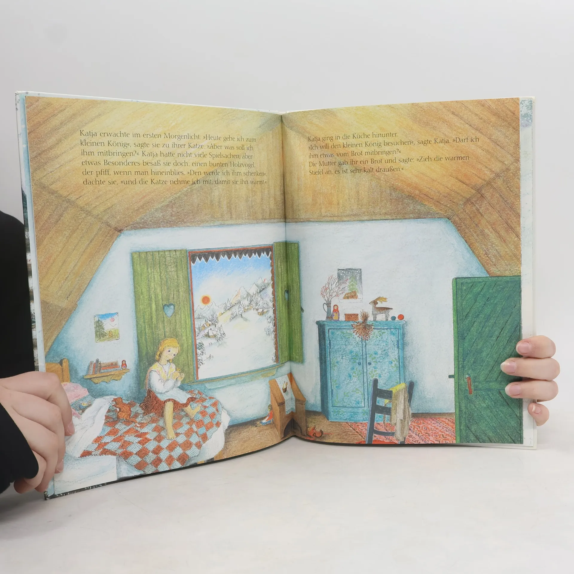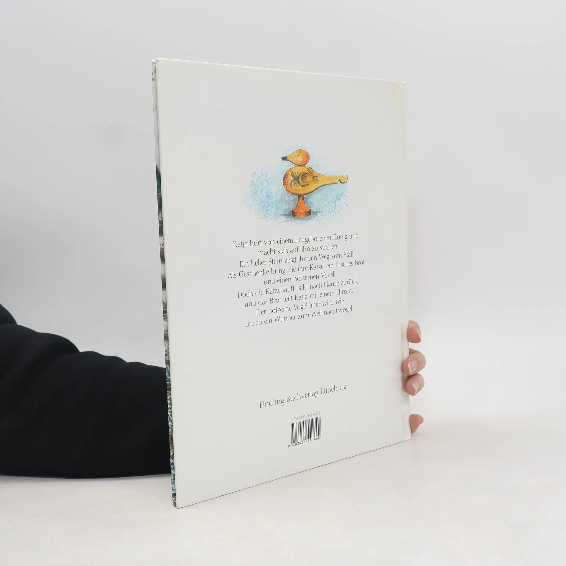 Katja hört von einem neugeborenen König und macht sich auf, ihn zu suchen. Ein heller Stern zeigt ihr den Weg zum Stall. Als Geschenke bringt sie ihre Katze, ein frisches Brot und einen hölzernen Vogel. Doch die Katze läuft bald nach Hause zurück, und das Brot teilt Katja mit einem Hirsch. Der hölzerne Vogel aber wird wie durch ein Wunder zum Weihnachtsvogel.