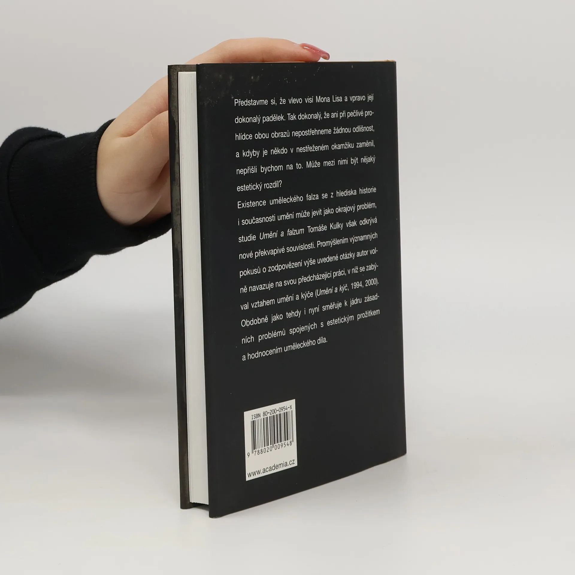 Představme si, že vlevo visí Mona Lisa a vpravo její dokonalý padělek. Tak dokonalý, že ani při pečlivé prohlídce obou obrazů nepostřehneme žádnou odlišnost, a kdyby je někdo v nestřeženém okamžiku zaměnil, nepřišli bychom na to. Může mezi nimi být nějaký estetický rozdíl? Existence uměleckého falza se z hlediska historie i současnosti umění může jevit jako okrajový problém, studie Umění a falzum Tomáše Kulky však odkrývá nové překvapivé souvislosti. Promýšlením významných pokusů o zodpovězení výše uvedené otázky autor volně navazuje na svou předcházející práci, v níž se zabýval vztahem umění a kýče (Umění a kýč, 1994, 2000). Obdobně jako tehdy i zde směřuje do centra zásadních problémů spojených s estetickým prožitkem a hodnocením uměleckého díla.