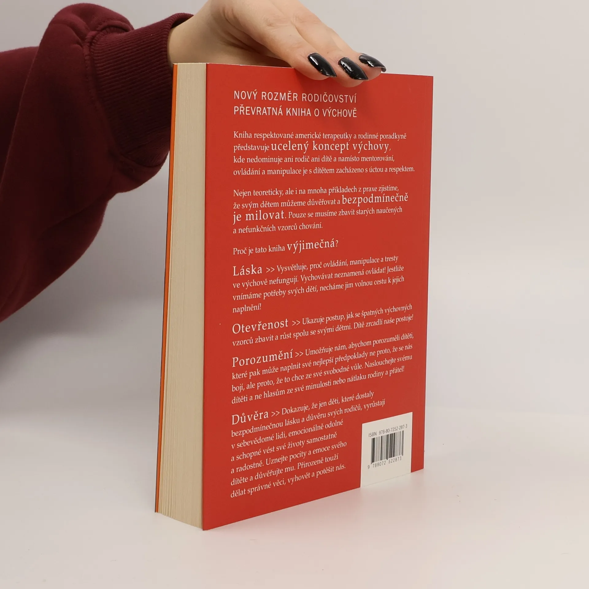 Kniha respektované americké terapeutky a rodinné poradkyně představuje ucelený koncept výchovy, kde nedominuje ani rodič ani dítě a namísto mentorování, ovládání a manipulace je s dítětem zacházeno s úctou a respektem. Nejen teoreticky, ale i na mnoha příkladech z praxe zjistíme, že svým dětem můžeme důvěřovat a bezpodmínečně je milovat. Pouze se musíme zbavit starých naučených a nefunkčních vzorců chování. Proč je tato kniha výjimečná? láska- vysvětluje, proč ovládání, manipulace a tresty ve výchově nefungují. otevřenost- ukazuje postup, jak se špatných výchovných vzorců zbavit a růst spolu se svými dětmi. porozumění- umožňuje nám, abychom porozuměli dítěti, které pak může naplnit své nejlepší předpoklady. důvěra- dokazuje, že jen děti, které dostaly bezpodmínečnou lásku a důvěru svých rodičů, vyrůstají v sebevědomé lidi, emocionálně odolné a schopné vést své životy samostatně a radostně.