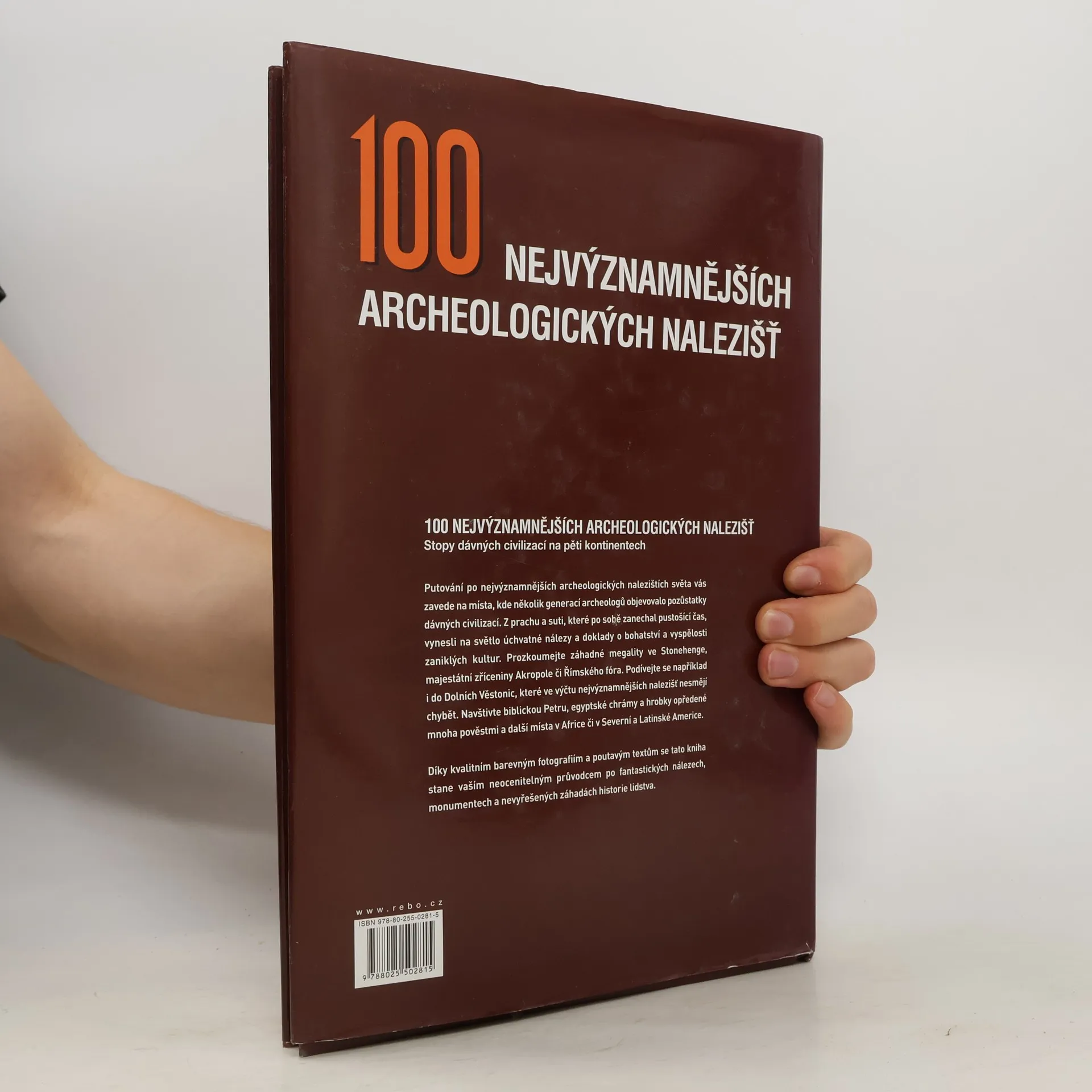 Další z řady výpravných publikací představuje stovku nejznámějších světových archeologických nalezišť. Povede čtenáře na putování za pozůstatky dávných civilizací, které podávají svědectví o bohatství a vyspělosti dávných kultur. S knihou můžou prozkoumat například záhadné megality ve Stonehenge, zříceniny Akropole, egyptské chrámy a hrobky, biblickou Petru nebo třeba i Dolní Věstonice. "obsáhlé portréty nejzajímavějších památek "přehledný souhrn základních turistických informací .