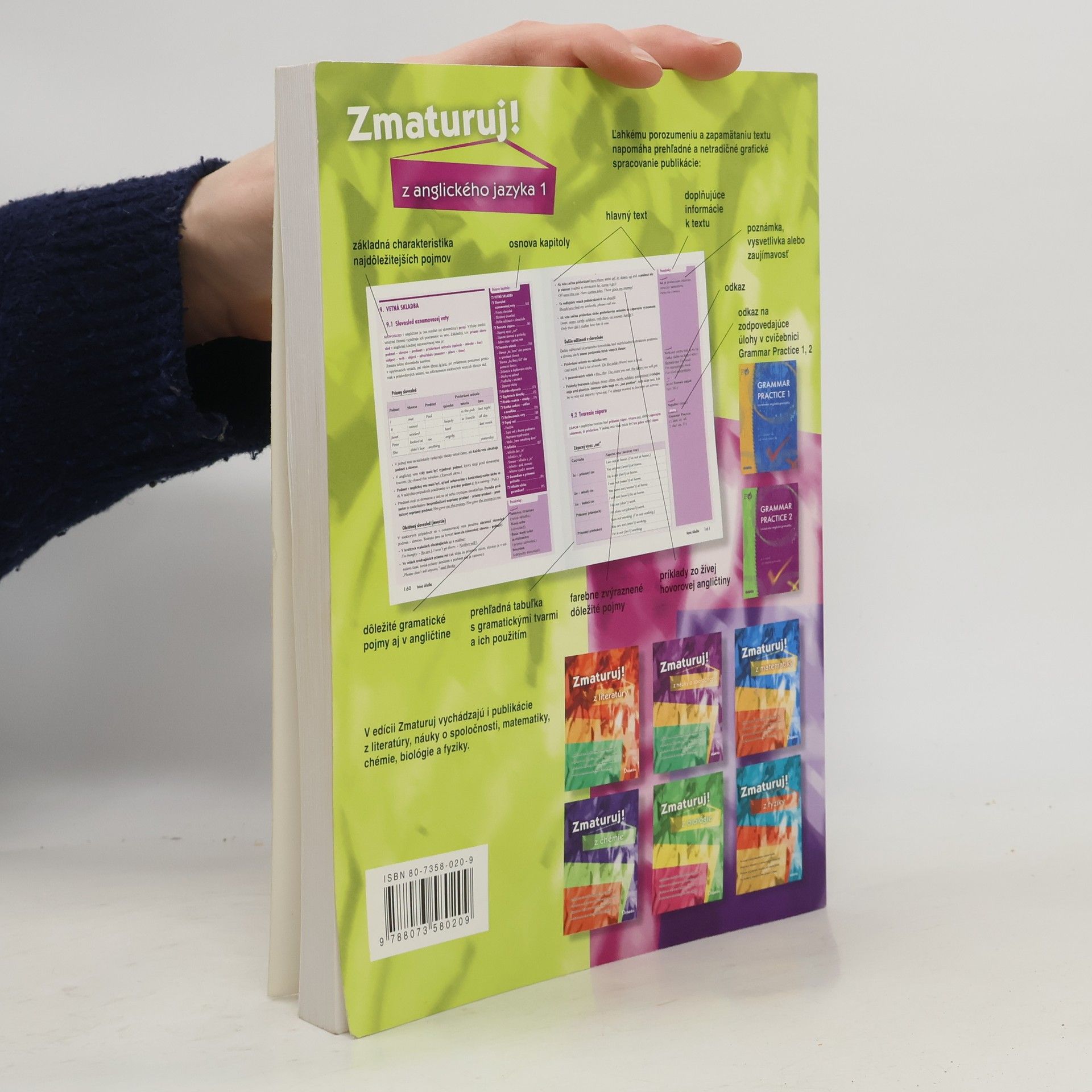 Praktický pomocník pre každého študenta, ktorý chce úspešne zmaturovať z angličtiny a uspieť na prijímacích skúškach na vysokú školu. Publikácia predkladá ucelený súhrn stredoškolského učiva gramatiky anglického jazyka. Všetky dôležité gramatické javy sú podrobne vysvetľované v slovenskom jazyku a sú doplnené množstvom príkladov (slov, väzieb, viet, fráz), ktoré vychádzajú z živej hovorovej angličtiny. Kapitoly sú systematicky doplnené prehľadnými tabuľkami, znázorňujúcimi gramatické tvary a ich použitie i praktickými prehľadmi rôznych väzieb (napr. predložkových, časových). V prílohe čitateľ nájde zhrnutie nepravidelných a frázových slovies, skrátených tvarov slovies aj základné zásady týkajúce sa pravopisu. Rozdelenie textu na hlavný text a doplňujúce poznámky v stĺpci na okraji umožňuje rozlíšiť základné a rozširujúce informácie. V poznámkovom stĺpci čitateľ nájde aj odkazy na cvičenia, v ktorých si môže príslušné gramatické javy precvičiť (v publikácii Grammar Practice 1, 2, Didaktis 2002). Vyhľadávanie v knihe zjednodušuje grafické zvýraznenie dôležitých pojmov a tiež register anglických a slovenských pojmov v závere knihy. Publikácia je určená študentom stredných škôl, ktorí ju využijú počas celého stredoškolského štúdia, na prípravu na maturitu i na prijímacie skúšky na vysoké školy.