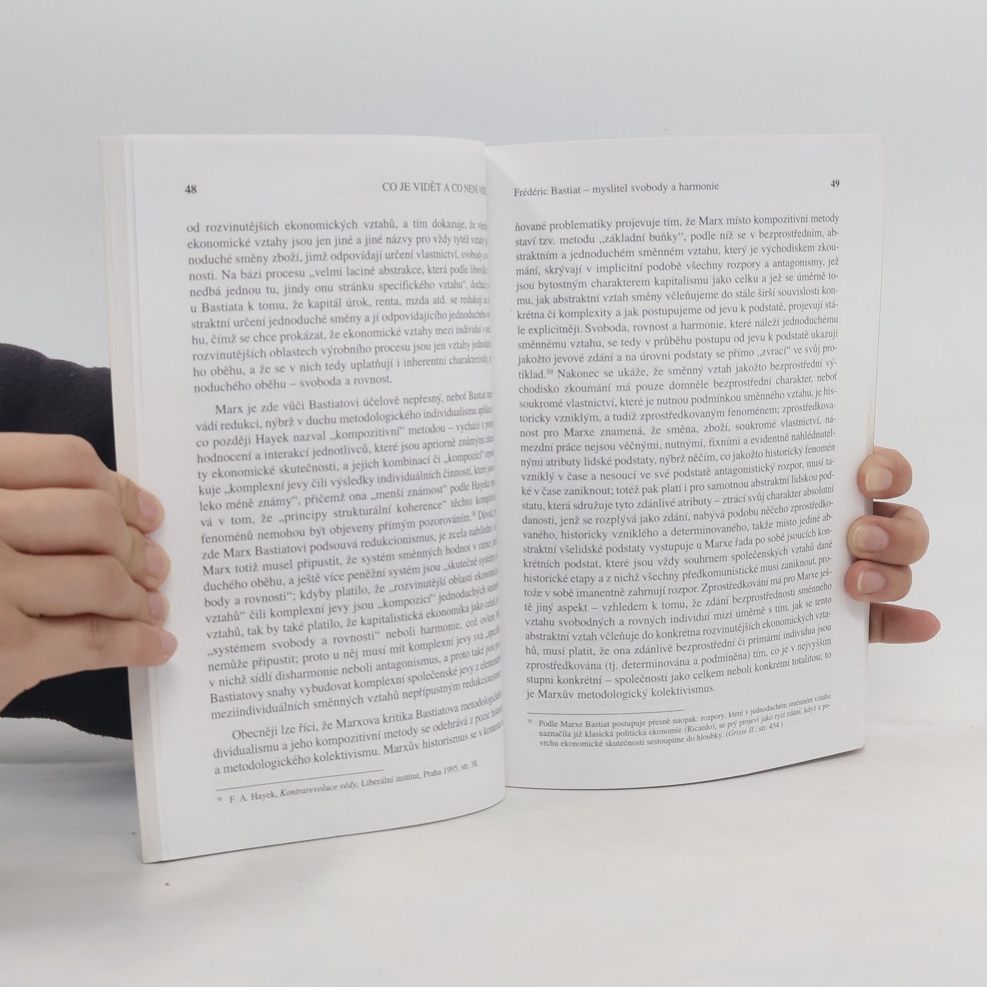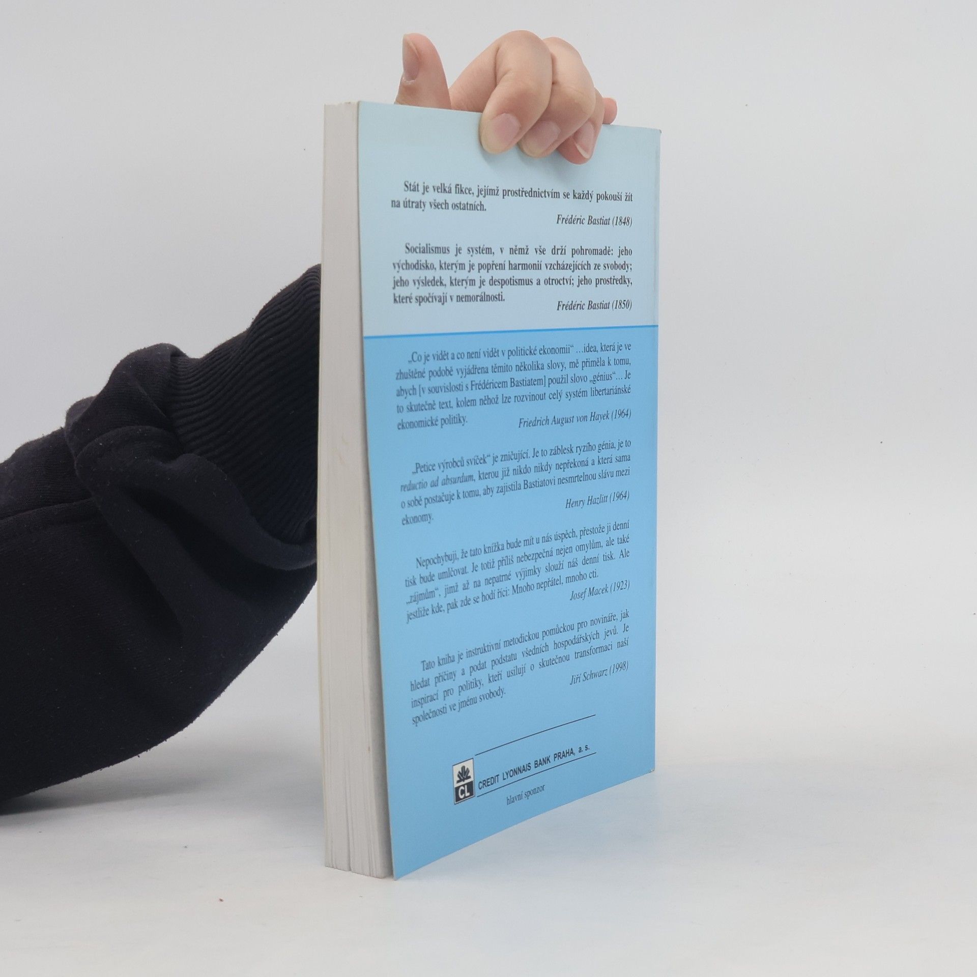 Frédéric Bastiat, který patří k téměř neznámým autorům a v učebnicích ekonomie se o něm navzdory jeho rozsáhlému dílu většinou nedočteme, vycházel při sepisování svých textů z metodologického základu, který by mu mohli mnozí současní ekonomové, ale také novináři i politici (všechna tato povolání Bastiat vykonával) závidět - byl jím zdravý rozum. Ano, takové myšlenky se rozvíjely ve Francii v polovině minulého století. A jelikož myšlenky vycházející ze zdravého rozumu nemohou na rozdíl od komplikovaně vyhlížejících moderních sofismat zastarat, mají i českému čtenáři po téměř 150 letech mnohé co říci. Ve sbírce esejů, která je uvedena obsáhlou studií doc. Jana Pavlíka, nalezneme mimo hlavního eseje Co je vidět a co není vidět, který dal název celé sbírce, také slavné eseje Petice výrobců svící, Dva systémy etiky, Obchodní bilance (přetištěný v Laissez Faire říjen 1998) a výňatek z Bastiatovy hry Tři konšelé.... celý text