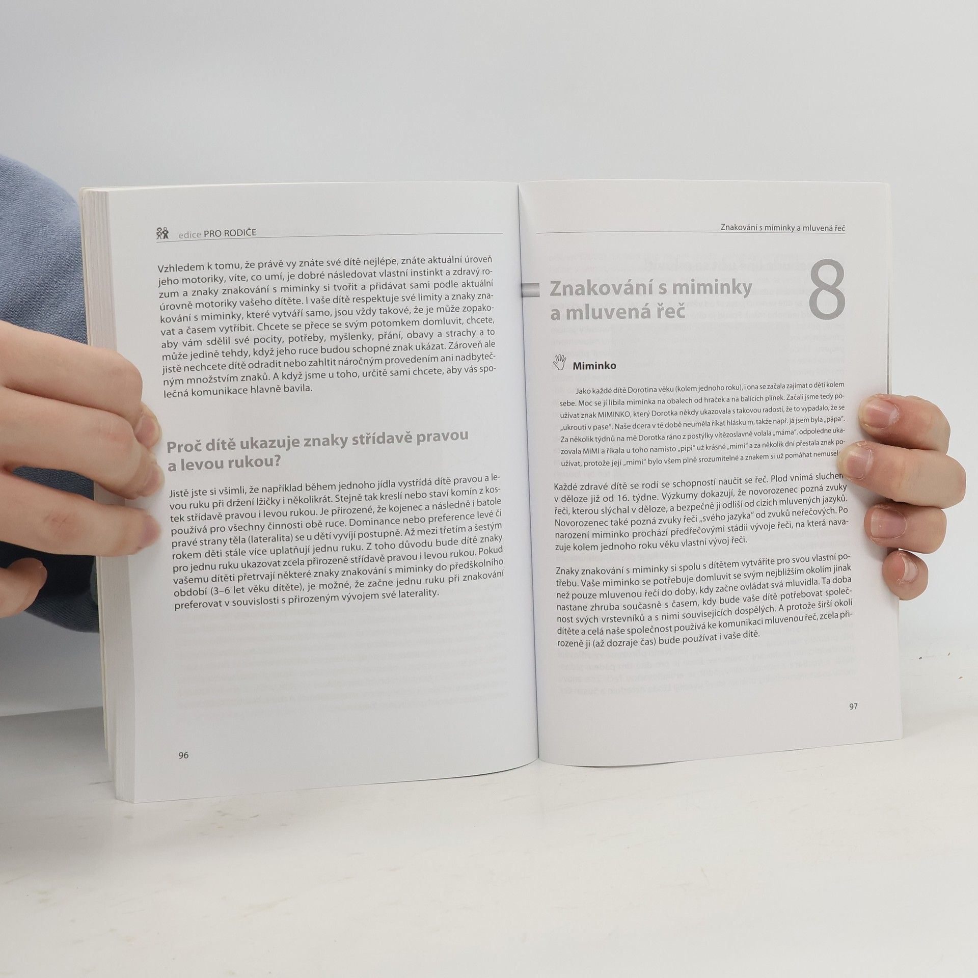 Podtitul: Komunikujeme přirozenými znaky a gesty Také někdy nevíte, proč se váš maličký vzteká, co vlastně chce či co ho rozplakalo? Účinnou cestou, jak mu porozumět, může být právě systém znakování s miminky. Nabídněte vašemu dítěti, které ještě neumí vůbec nebo dobře mluvit, možnost, jak se s vámi dorozumět. Kniha přináší srozumitelný návod k tomu, jak rozvíjet přirozenou komunikaci malých dětí gesty a znaky.Autorka klade velký důraz nejen na odborné informace, ale zejména na praktické zkušenosti využití ověřeného komunikačního systému gesty a znaky v každodenním životě s dítětem raného věku. Součástí publikace je i slovník základních znaků.... celý text