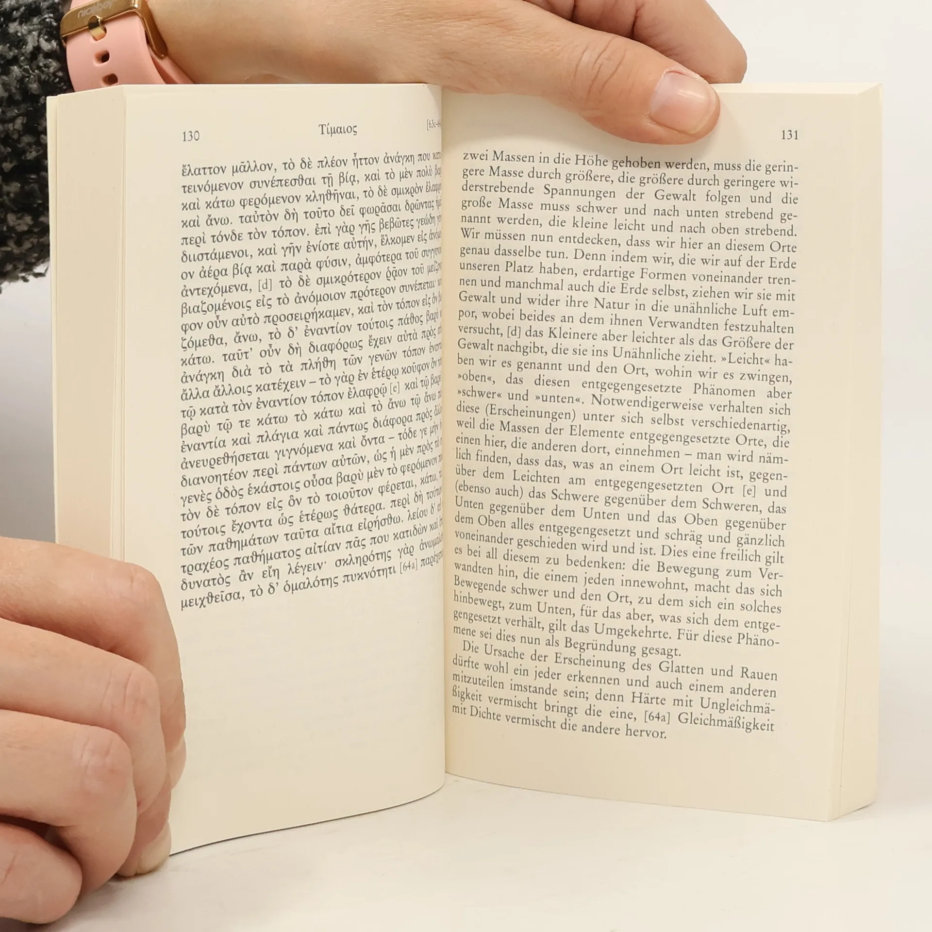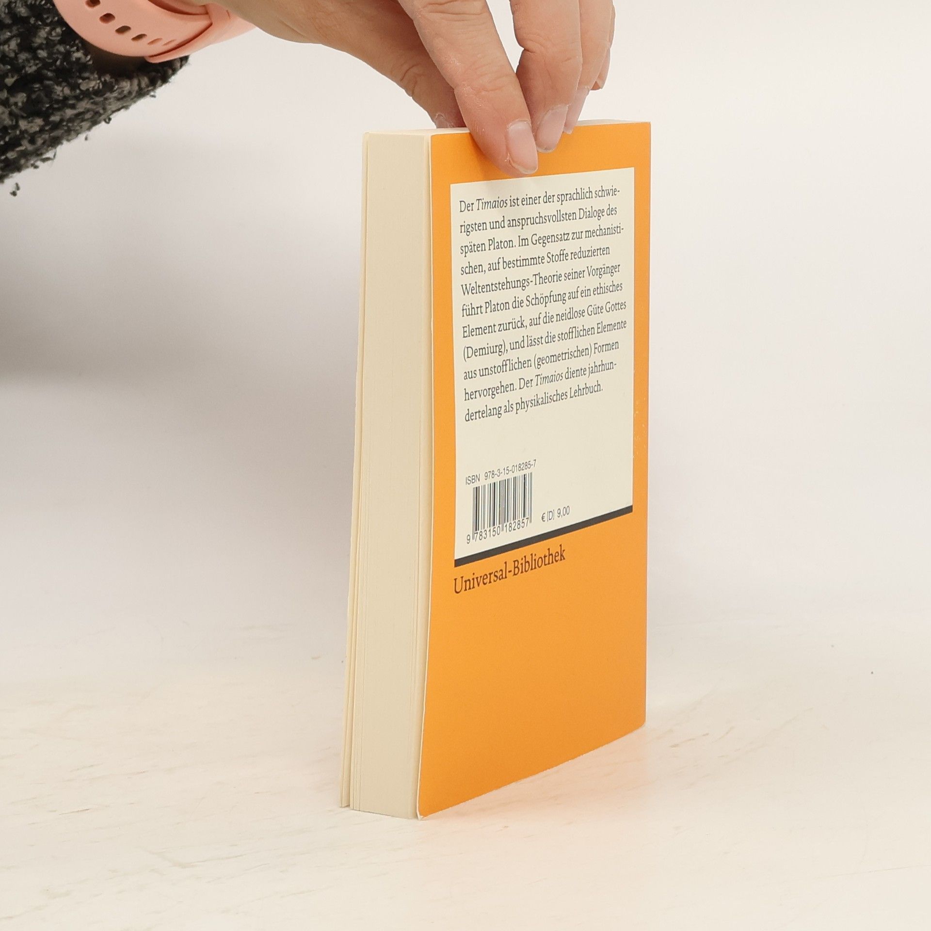 Der »Timaios« ist einer der sprachlich schwierigsten und anspruchsvollsten Dialoge des späten Platon. Im Gegensatz zur mechanistischen, auf bestimmte Stoffe reduzierten Weltentstehungs-Theorie seiner Vorgänger führt Platon die Schöpfung auf ein ethisches Element zurück, auf die neidlose Güte Gottes (Demiurg), und lässt die stofflichen Elemente aus unstofflichen (geometrischen) Formen hervorgehen. Der »Timaios« diente jahrhundertelang als physikalisches Lehrbuch. Sprachen: Deutsch, Griechisch (bis 1453)