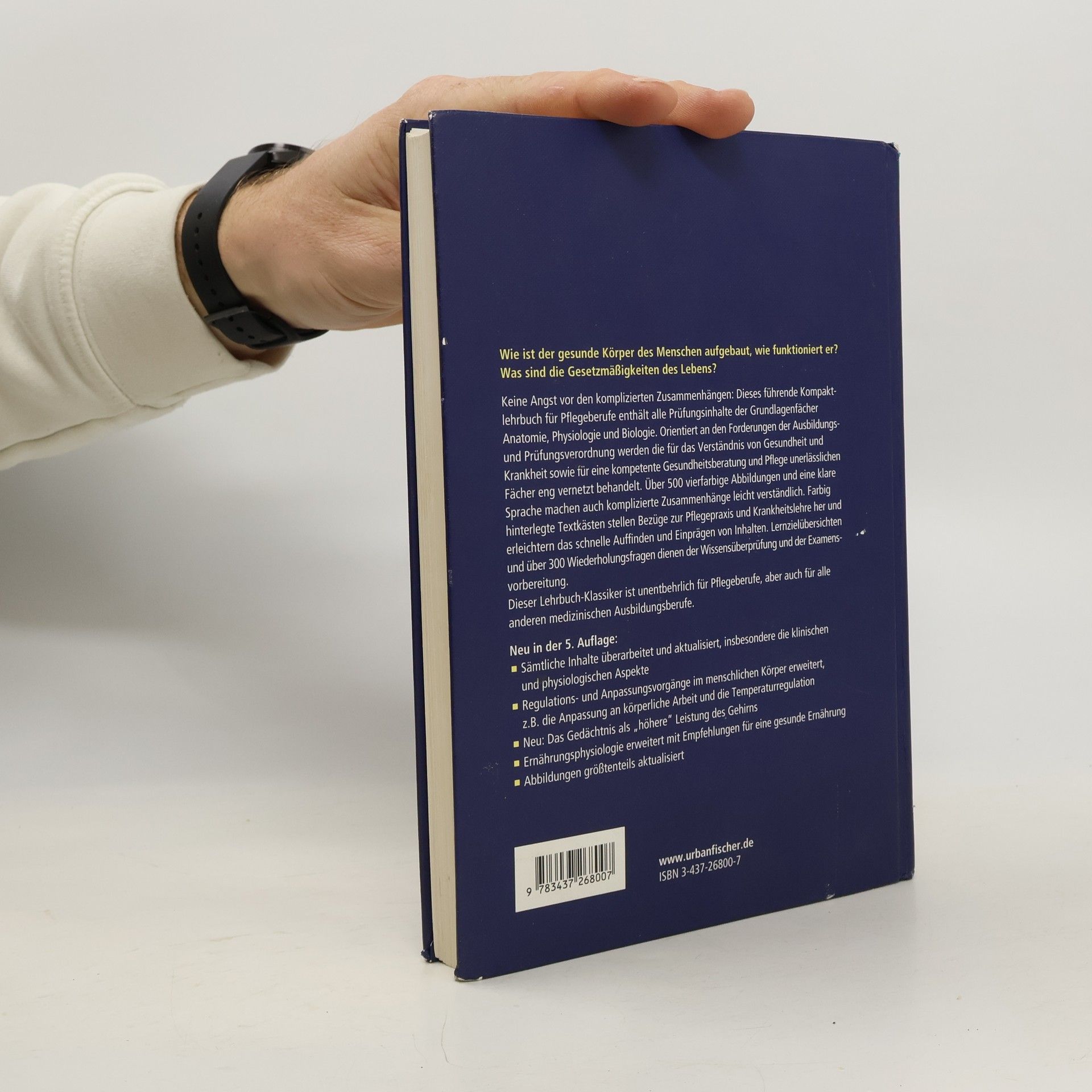 Kompakt und praxisnah bietet dieser Lehrbuch-Klassiker für die Pflegeausbildung alle Prüfungsinhalte der Grundlagenfächer Anatomie, Physiologie und Biologie. Diese sind eng vernetzt und klar auf die pflegerische Berufspraxis ausgerichtet. Mit über 500 hervorragenden Farbillustrationen und 300 Wiederholungsfragen. Neu in der 5. Auflage: Sämtliche Inhalte überarbeitet und aktualisiert, insbesondere die Pflegehinweise und die klinischen und physiologischen Aspekte Regulations- und Anpassungsvorgänge im menschlichen Körper erweitert, z. B. die Anpassung an körperliche Arbeit und die Temperaturregulation Neu hinzugekommen: Das Gedächtnis als „höhere“ Leistung des Gehirns Ernährungsphysiologie erweitert, neueste Empfehlungen für eine gesunde Ernährung Abbildungen größtenteils aktualisiert
