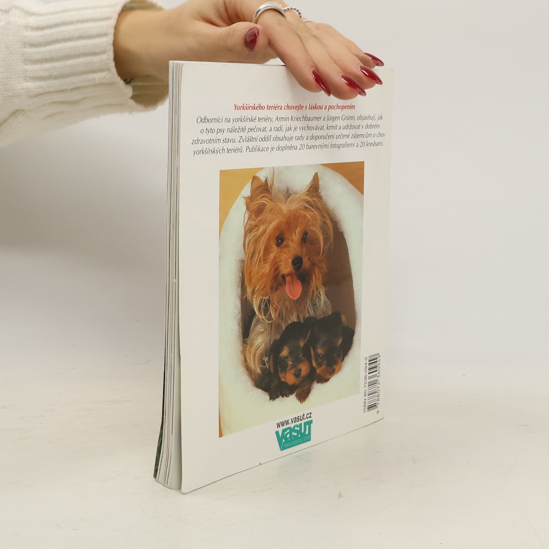Odborníci na yorkšírské teriéry, Armin Kriechbauer a Jürgen Grünn, objasňují, jak o tyto psy náležitě pečovat, a radí, jak je vychovávat, krmit a udržovat v dobrém zdravotním stavu. Zvláštní oddíl obsahuje rady a doporučení určené zájemcům o chov yorkšírských teriérů. Publikace je doplněna 20 barevnými foografiemi a 20 kresbami.