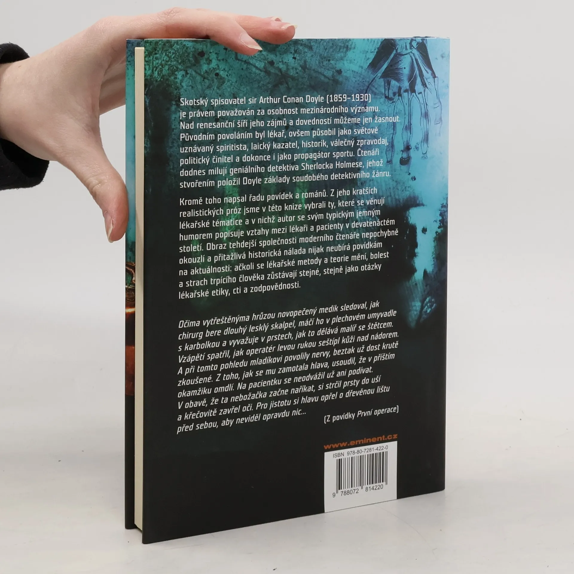 Skotský spisovatel sir Arthur Conan Doyle (1859-1930) je právem považován za osobnost mezinárodního významu. Nad renesanční šíří jeho zájmů a dovedností můžeme jen žasnout. Původním povoláním byl lékař, ovšem působil jako světově uznávaný spiritista, laický kazatel, historik, válečný zpravodaj, politický činitel a dokonce i jako propagátor sportu. Čtenáři dodnes milují geniálního detektiva Sherlocka Holmese, jehož stvořením položil Doyle základy soudobého detektivního žánru. Kromě toho napsal řadu povídek a románů. Z jeho kratších realistických próz jsme v této knize vybrali ty, které se věnují lékařské tématice a v nichž autor se svým typickým jemným humorem popisuje vztahy mezi lékaři a pacienty v devatenáctém století. Obraz tehdejší společnosti moderního čtenáře nepochybně okouzlí a přitažlivá historická nálada nijak neubírá povídkám na aktuálnosti: ačkoli se lékařské metody a teorie mění, bolest a strach trpícího člověka zůstávají stejné, tak jako otázky lékařské etiky, cti a zodpovědnosti.