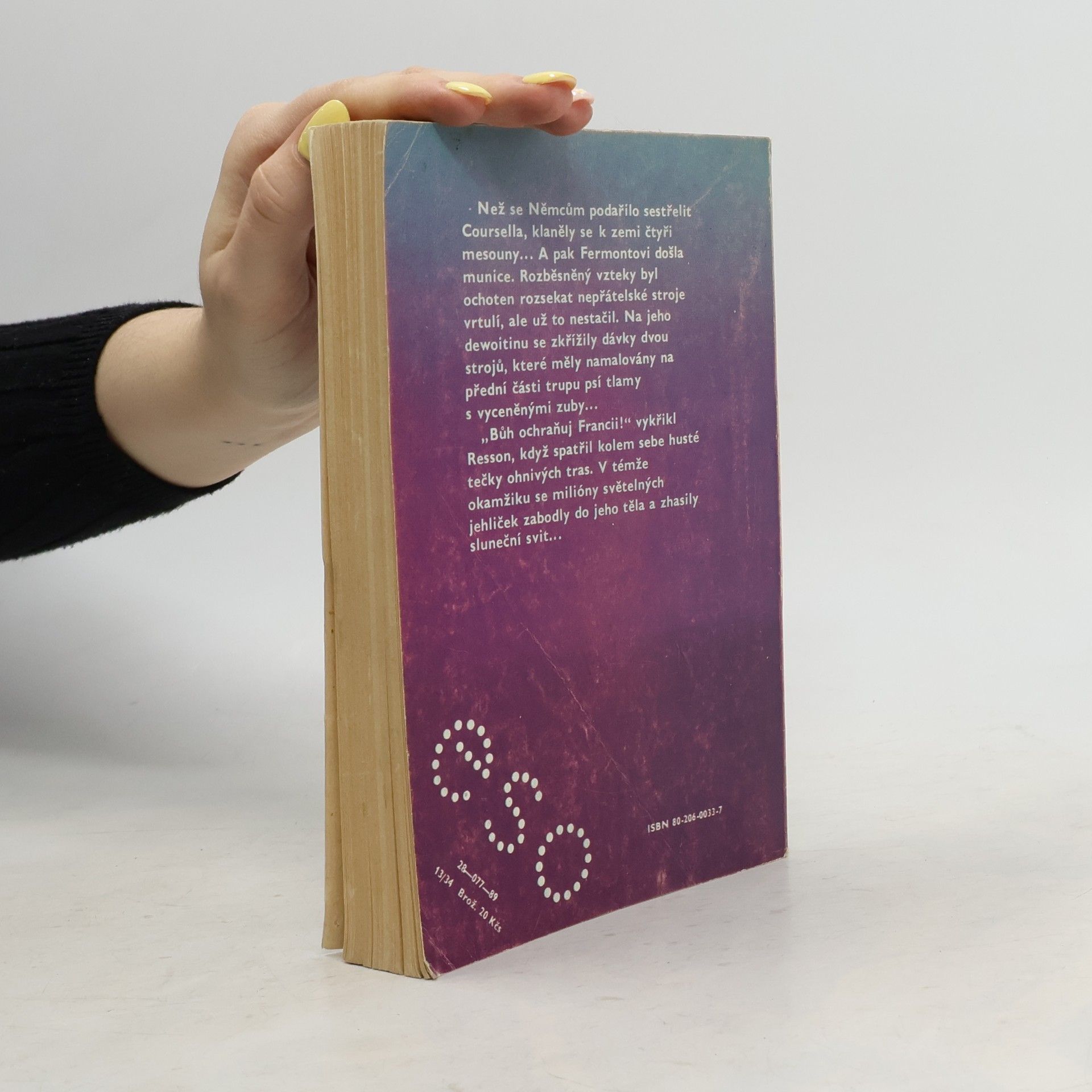 Než se Němcům podařilo sestřelit Coursella, klaněly se k zemi čtyři mesouny... A pak Fermontovi došla munice. Rozběsněný vzteky byl ochoten rozsekat nepřátelské stroje vrtulí, ale už to nestačil. Na jeho dewoitinu se zkřížily dávky dvou strojů, které měly namalovány na přední části trupu psí tlamy s vyceněnými zuby... "Bůh ochraňuj Francii!" vykřikl Resson, když spatřil kolem sebe husté tečky ohnivých tras. V témže okamžiku se milióny světelných jehliček zabodly do jeho těla a zhasily sluneční svit...