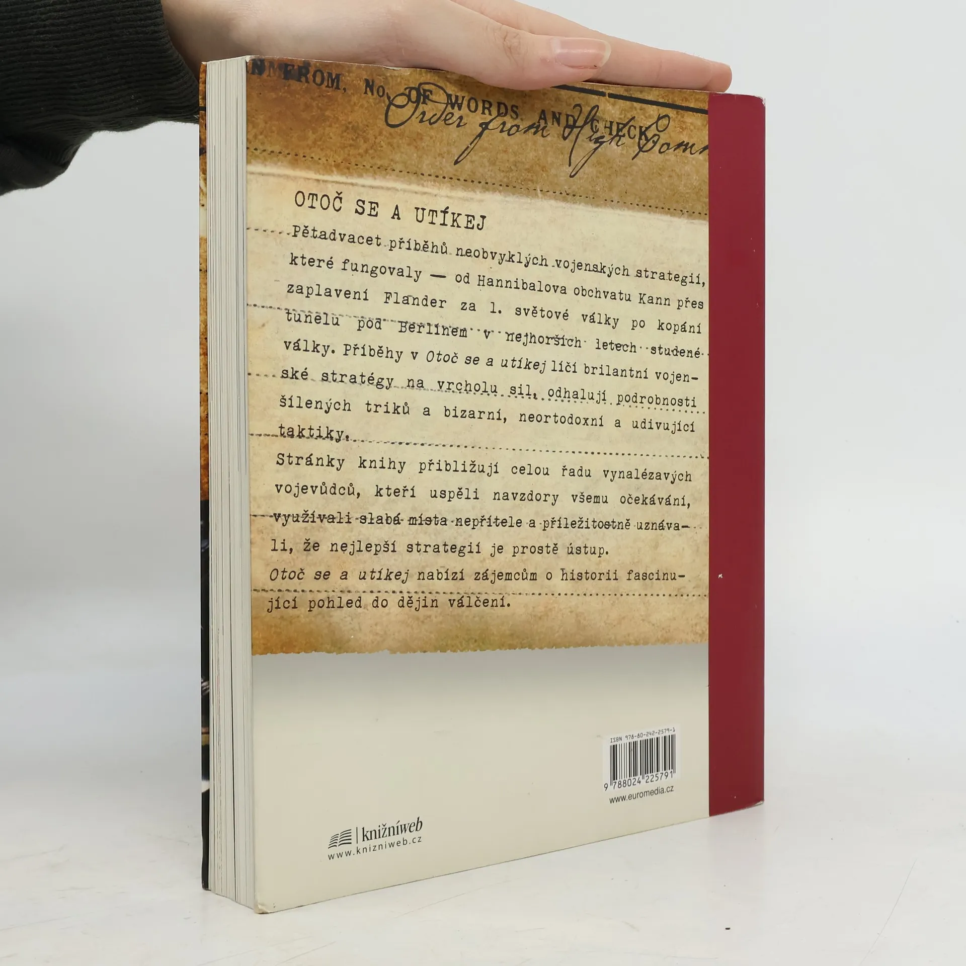 Podtitul: Strhující příběhy netradičních vojenských strategií, které uspěly Otoč se a utíkej je pouť netradičními cestami, na nichž vojevůdci po tisíce let vynalézali a objevovali černé umění války. Tato historie se zaměřuje na neortodoxní vojenské strategie a nevídané nápady vůdců, jejichž nekonvenční taktiky změnily průběh bitev a staly se součástí vojenského kánonu. Například past u Kann, kterou v roce 216 př. n. l. připravil Hannibal, zabila padesát tisíc Římanů za jediný den a byla často napodobována (většinou neúspěšně). Náhlý obrat admirála Toga v bitvě o Cušimu v roce 1905 přinesl Japoncům vítězství nad ruskou flotilou. Alexandr Veliký obsadil Týr v roce 332 př. n. l. vybudováním náspu přes přístav, což bylo jedno z nejtvrdohlavějších obléhání v historii. Operace Fortitude umožnila Spojencům zmást německé velení ohledně vylodění v den D. Taktika předstíraného ústupu, zdokonalena Mongoly, byla využívána tisíci bezejmenných. Příběhy Maorů, generála Konfederace a dalších ukazují, jak zoufalé taktiky dokázaly obrátit směr bitvy. Celkem dvacet pět napínavých a inspirativních příběhů nabízí fascinující pohled do dějin válečnictví a představuje jeho nejvýraznější postavy.