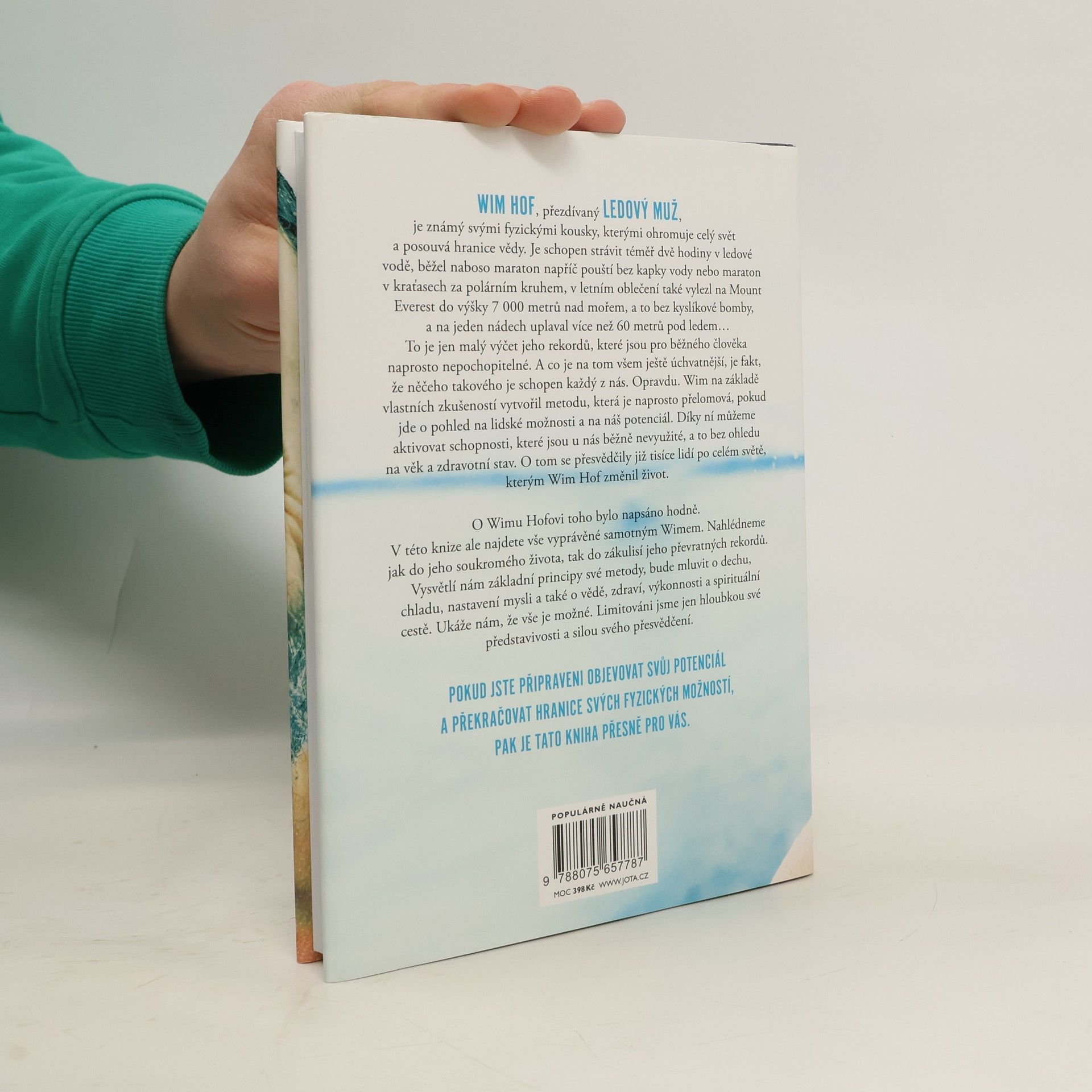 Jediná autorizovaná kniha Wima Hofa představuje převratnou metodu, která nám umožňuje využít náš fyzický i duševní potenciál. Wim Hof, známý jako Ledový muž, ohromuje svět svými neuvěřitelnými výkony, jako je strávení téměř dvou hodin v ledové vodě, běhání maratonů bez vody a výstupy na Mount Everest bez kyslíku. Tyto rekordy mohou vypadat nepochopitelně, ale Hof tvrdí, že podobných schopností může dosáhnout každý z nás. Na základě svých zkušeností vytvořil metodu, která mění pohled na lidské možnosti a aktivuje nevyužité schopnosti, bez ohledu na věk či zdravotní stav. Tisíce lidí po celém světě již pocítily pozitivní změny ve svém životě díky této metodě. Kniha nabízí osobní pohled na Hofův život a zákulisí jeho rekordů. Vysvětluje základní principy jeho metody, včetně technik dýchání, práce s chladem, nastavení mysli a souvislostí se zdravím a spirituálním rozvojem. Hof ukazuje, že naše limity jsou určeny pouze hloubkou naší představivosti a silou přesvědčení. Pokud jste připraveni objevovat svůj potenciál a překonávat fyzické hranice, tato kniha je pro vás. „Tato metoda je jednoduchá, přístupná a vědecky podložená. Může ji praktikovat kdokoli, bez dogmat, pouze s přijetím a svobodou.“