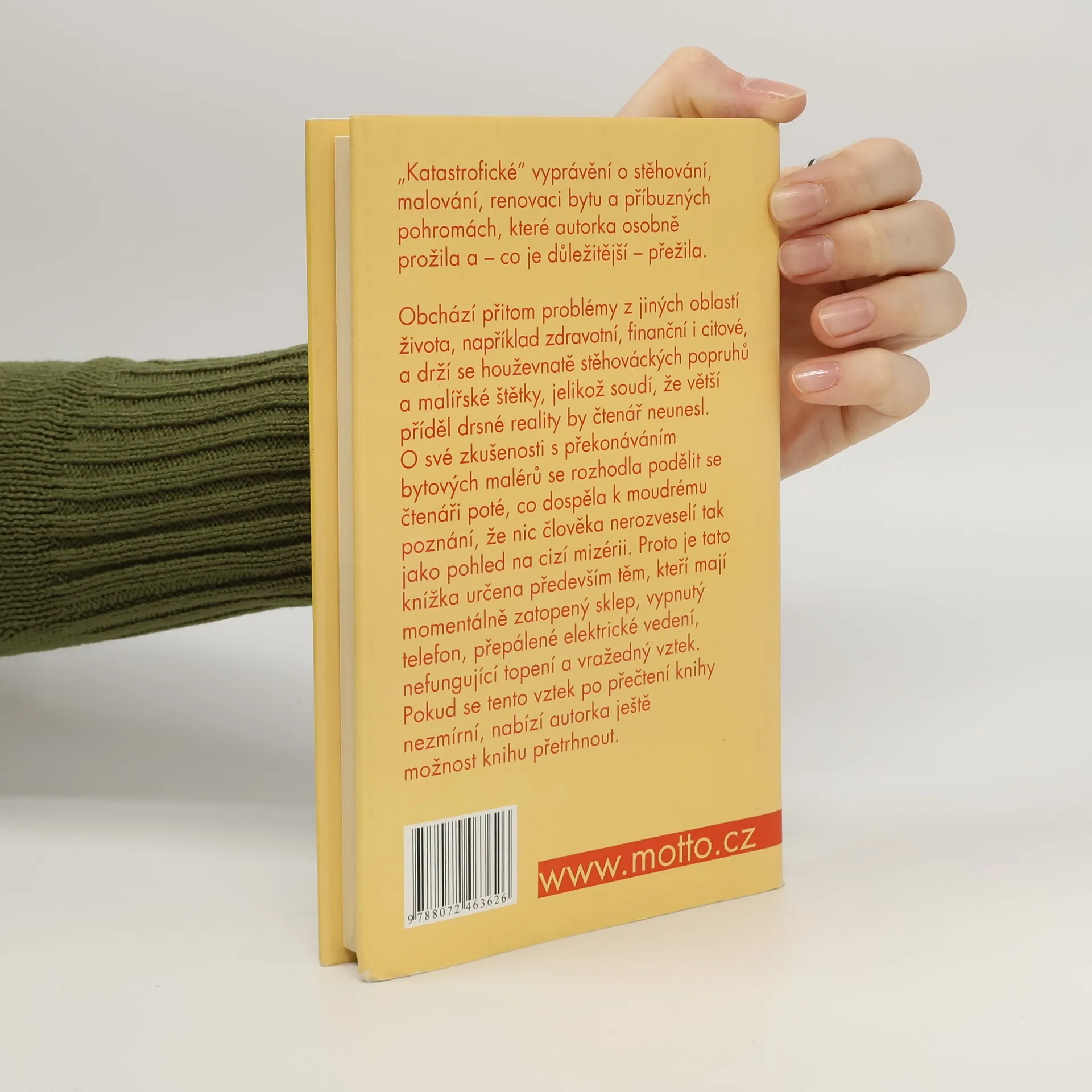 „Katastrofické“ vyprávění o stěhování, malování, renovaci bytu a příbuzných pohromách, které autorka osobně prožila a – co je důležitější – přežila. Obchází přitom problémy z jiných oblastí života, například zdravotní, finanční i citové, a drží se houževnatě stěhováckých popruhů a malířské štětky, jelikož soudí, že větší příděl drsné reality by čtenář neunesl. O své zkušenosti s překonáváním bytových malérů se rozhodla podělit se čtenáři poté, co dospěla k moudrému poznání, že nic člověka nerozveselí tak jako pohled na cizí mizérii. Proto je tato knížka určena především těm, kteří mají momentálně zatopený sklep, vypnutý telefon, přepálené elektrické vedení, nefungující topení a vražedný vztek. Pokud se tento vztek po přečtení knihy nezmírní, nabízí autorka ještě možnost knihu přetrhnout.