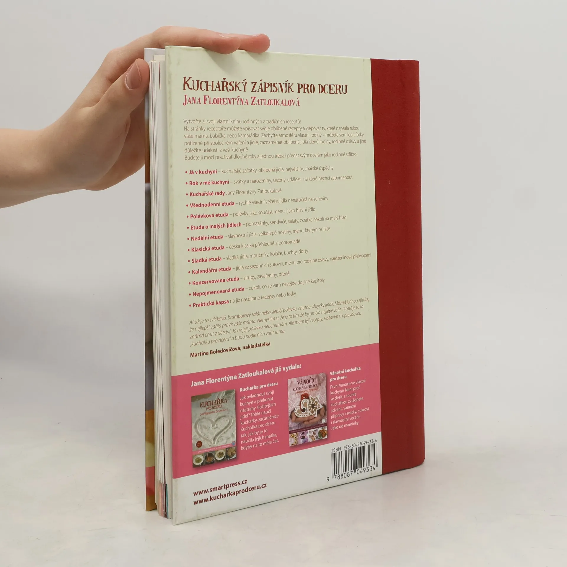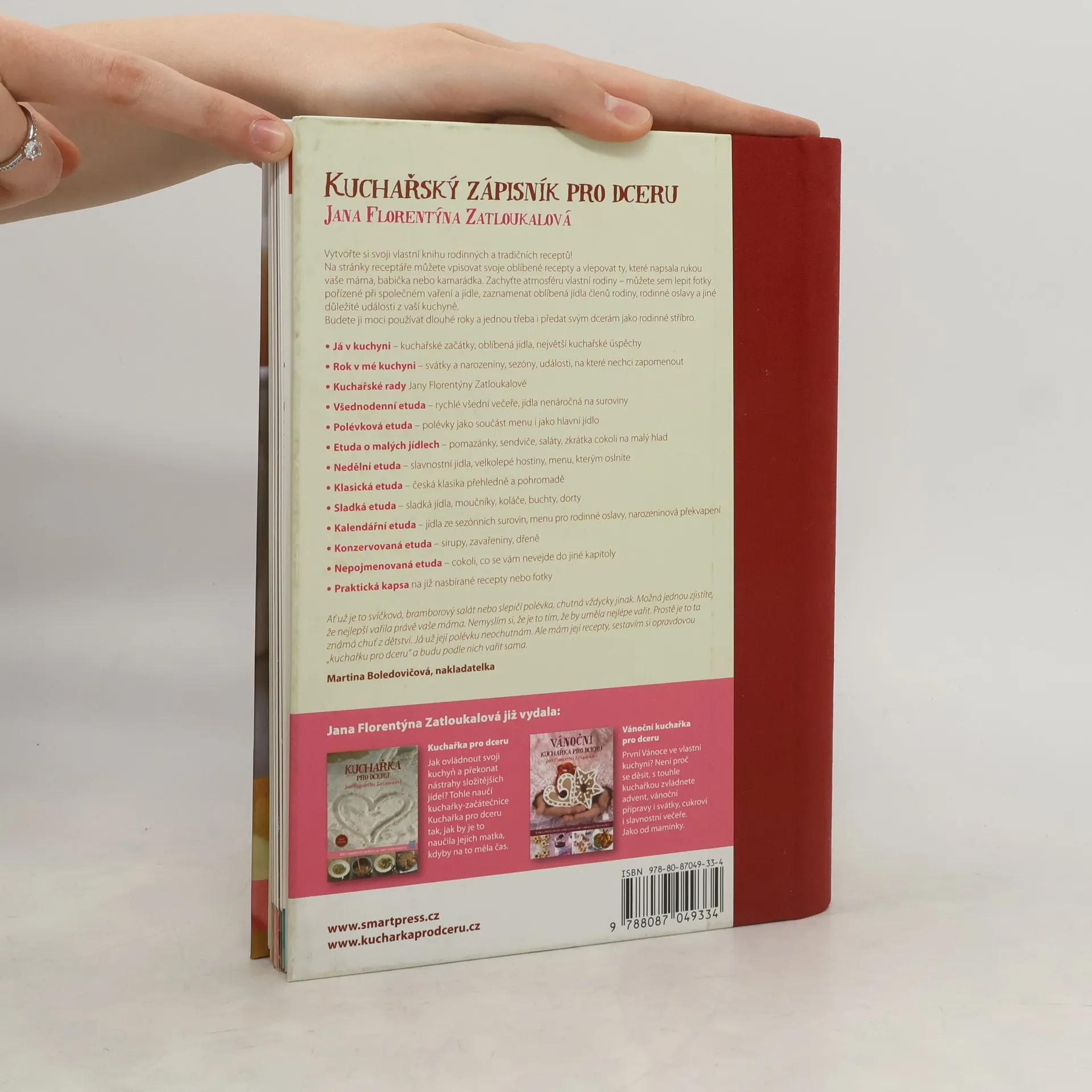 Perfektně vyzkoušených receptů je ale mnohem víc - která z nás nemá někde v šuplíku recepty narychlo napsané na útržcích papíru nebo vystřižené z časopisu? Díky tomuto praktickému pomocníku si v nich konečně můžete udělat pořádek a vytvořit si svou vlastní kuchařku., Na stránky tohoto receptáře můžete nejen psát oblíbené recepty, ale i vlepovat recepty napsané rukou vašich blízkých, fotky, nejlepší recepty z časopisů nebo zaznamenávat oblíbená jídla členů rodiny, výsledky svých kuchařských experimentů, rodinné oslavy nebo důležité události z vaší kuchyně. Kniha je navíc doplněna spoustou dobrých rad, jak si poradit se základními kuchařskými postupy, ale i jak nenaletět špatnému receptu a jak poznat, který je dobrý. U jídla, ať už ve všední den nebo ve svátek, se schází celá rodina a ty nejdůležitější věci se odehrávají právě tam. Zaznamenejte je.