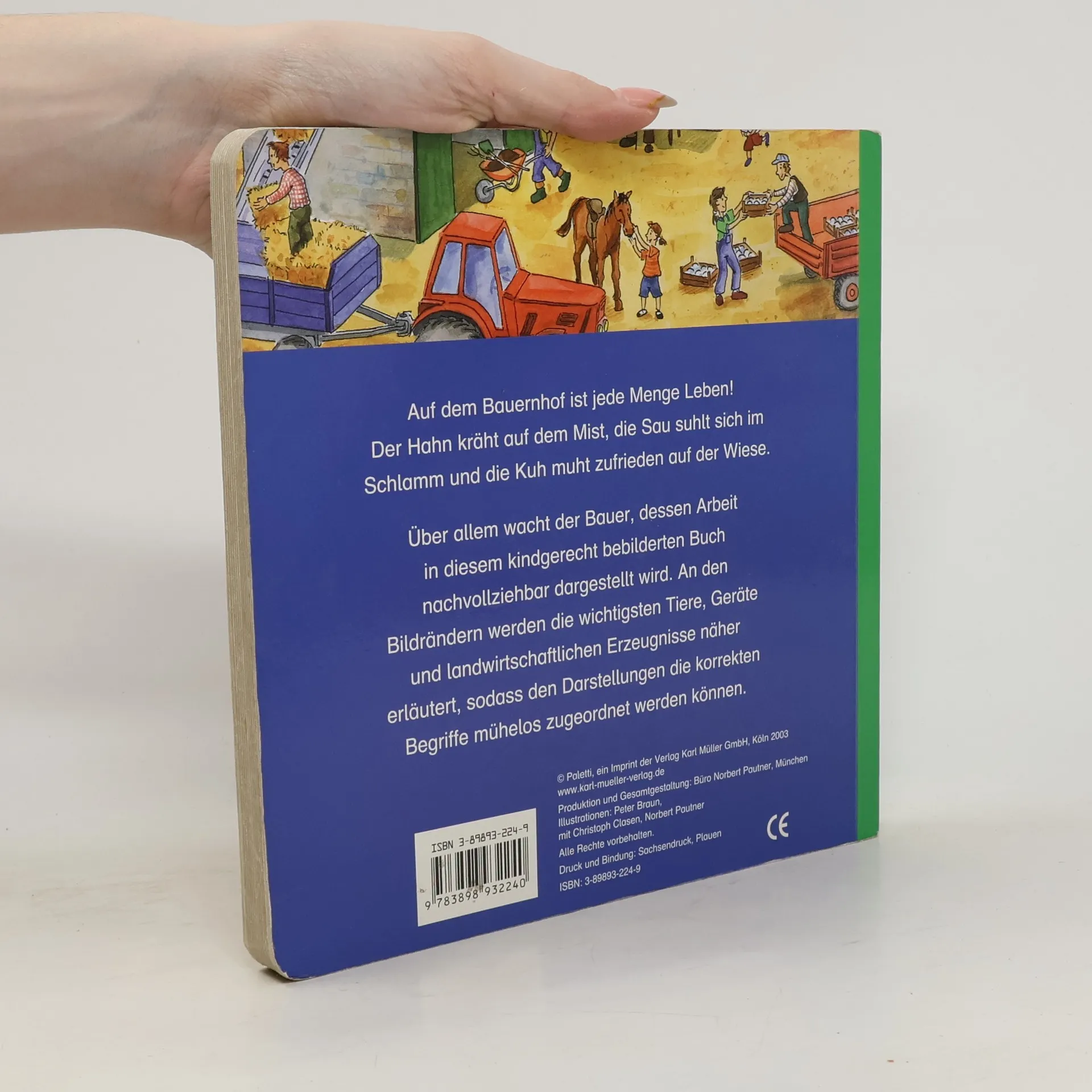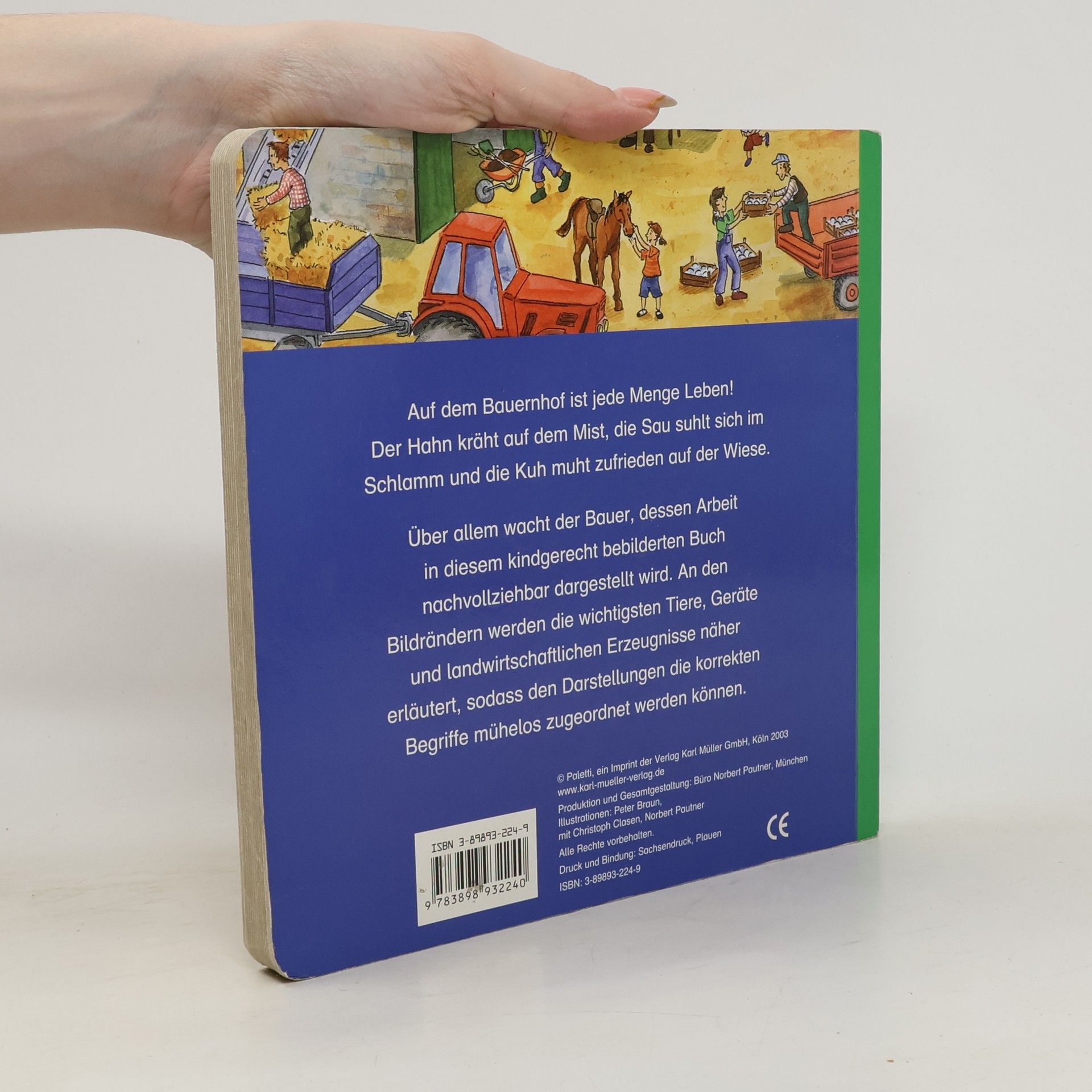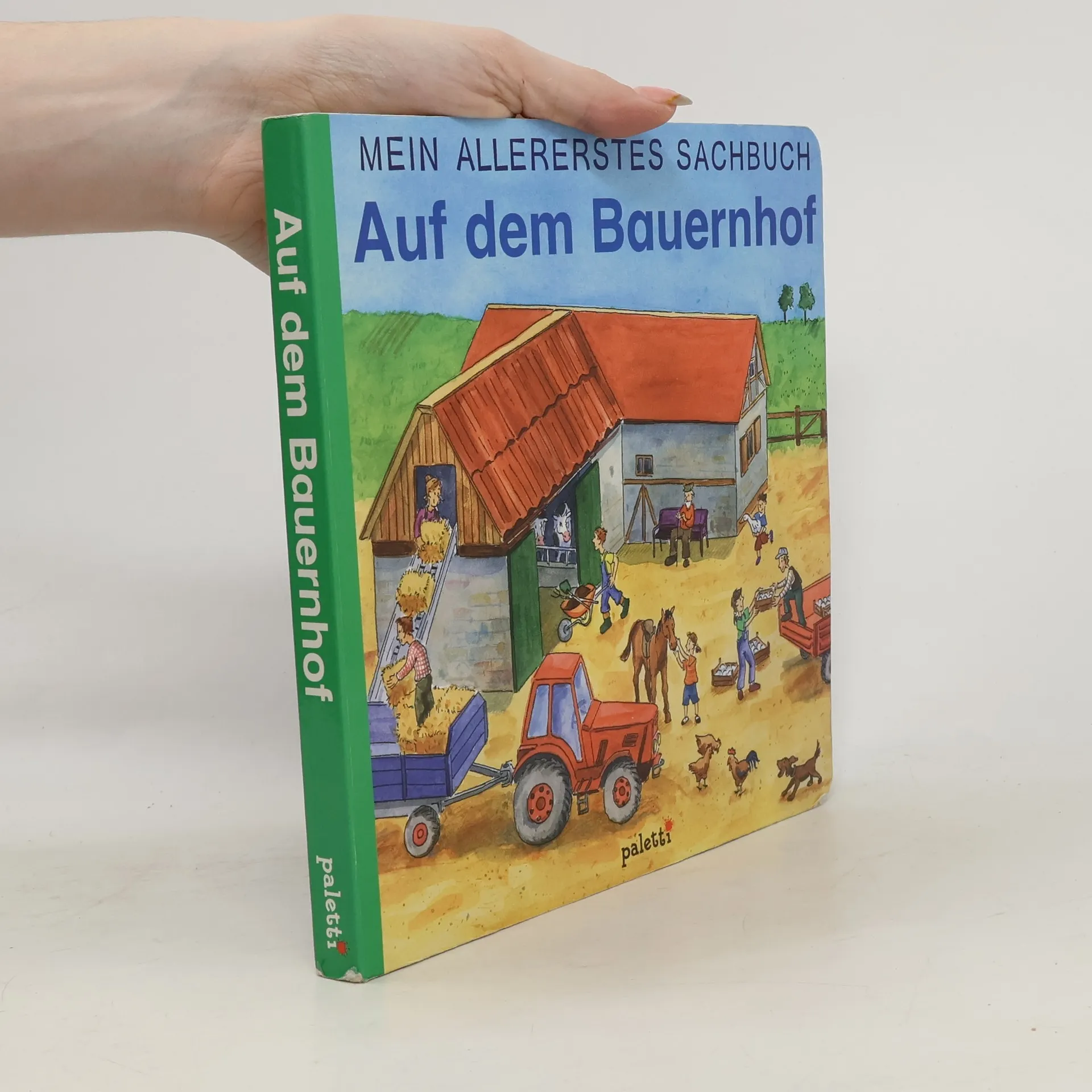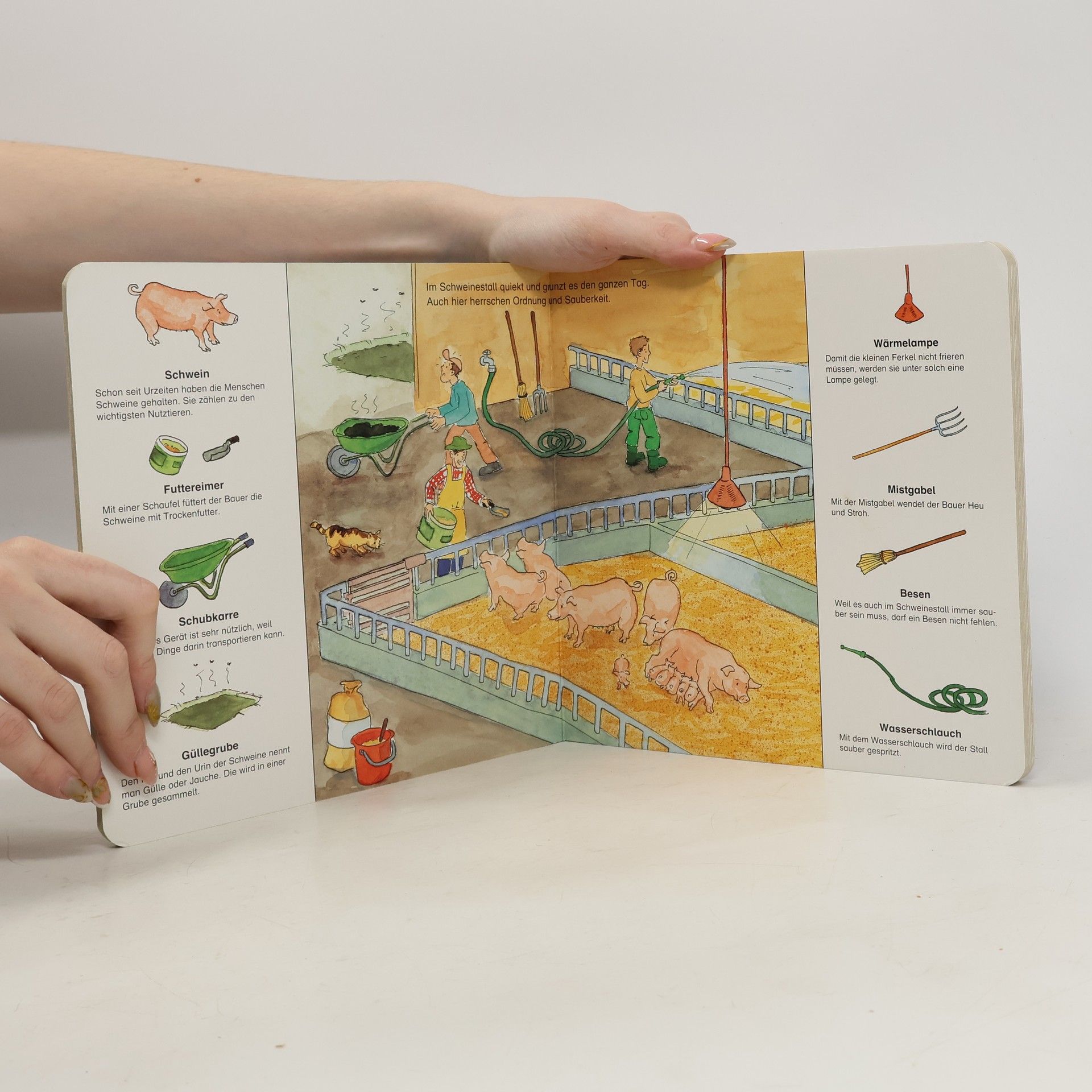 Auf dem Bauernhof gibt es immer viel zu tun: die Kühe werden gemolken, der Schweinestall ausgemistet, die Felder bestellt und die Ernte eingefahren. Bildwörterbuch über die verschiedenen Arbeiten, Geräte und Fahrzeuge auf einem Bauernhof.