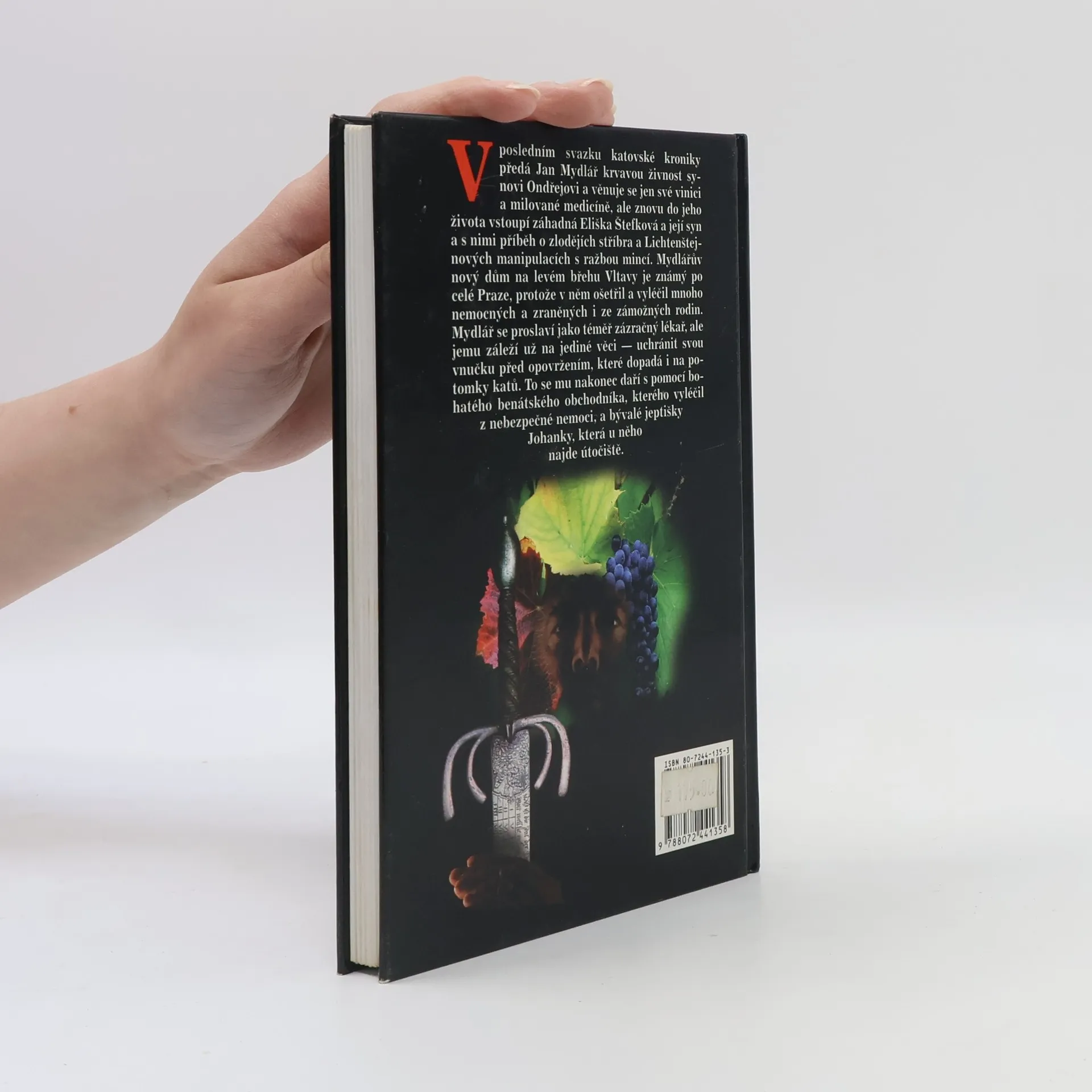 Závěrečná kniha trilogie Kronika katů Mydlářů. V poslední svazku katovské kroniky předá Jan Mydlář krvavou živnost synovi Ondřejovi a věnuje se jen své vinici a milované medicíně, ale znovu do jeho života vstoupí záhadná Eliška Štefková a její syn a s nimi příběh o zlodějích stříbra a Lichtenštejnových manipulacích s ražbou mincí. Mydlářův nový dům na levém břehu Vltavy je známý po celé Praze, protože v něm ošetřil a vyléčil mnoho nemocných a zraněných i ze zámožných rodin. Mydlář se proslaví jako téměř zázračný lékař, ale jemu záleží už na jediné věci - uchránit svou vnučku před opovržením, které dopadá i na potomky katů. To se mu nakonec daří s pomocí bohatého benátského obchodníka, kterého vyléčil z nebezpečné nemoci, a bývalé jeptišky Johanky, která u něho najde útočiště.