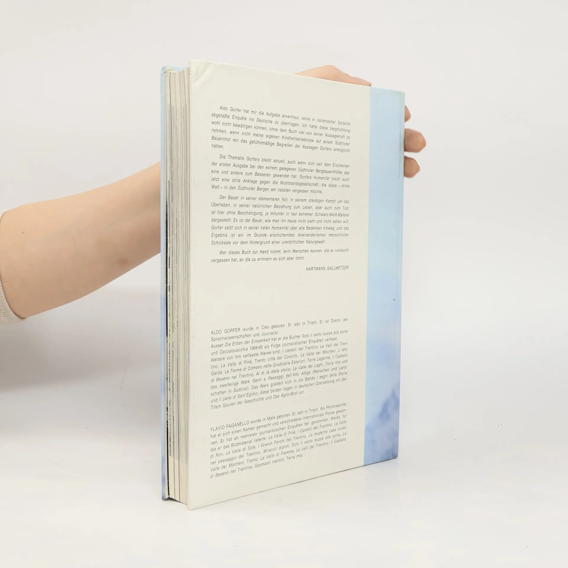 Im Jahr 1973 sind der Journalist Aldo Gorfer und der Fotograf Flavio Faganello in den Wintermonaten durch Südtirol gezogen, um die Lebenssituation der Menschen auf einsam gelegenen Bergbauernhöfen zu dokumentieren. Dem Trienter Autorenpaar ist es trotz sprachlicher Barrieren, Misstrauen und dem verschlossenen Charakter der Leute gelungen, ein bis heute außergewöhnliches Buch des harten Lebensalltages auf über 1500 Metern Höhe zu entwerfen. Die Beobachtungen, Bemerkungen, Ableitungen, die der in diese ihm fremden Bereiche eindringende Autor anstellt, sind lesenswert; die ihnen zur Seite gestellten Bilder sprechen für sich. »Die intellektuellen und sozialen Gedankenspielereien verlieren Bedeutung und Wert, die Wirklichkeit wird eine andere, Träume ... werden Wirklichkeit, sie sind nichts anderes als von der Natur selbst geschriebene Geschichte.« (Die Zeit)